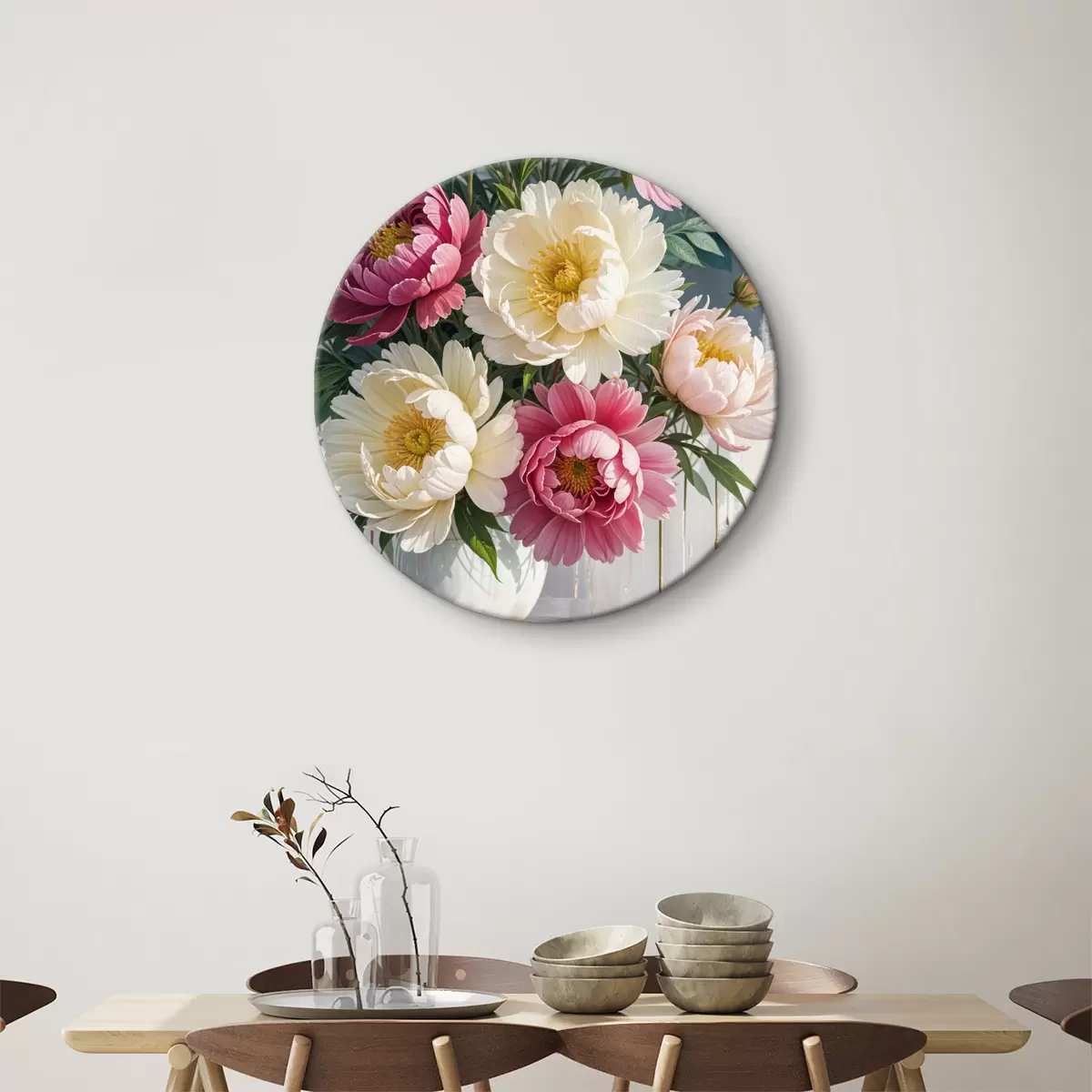 Ronde schilderijen Een boeket van levendige pioenrozen in verschillende tinten roze, wit en geel met verfspatten Nr r40403