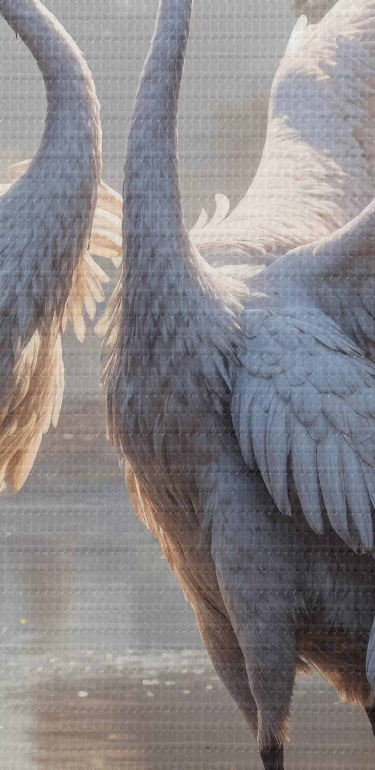 Ronde schilderijen Twee grote grijze kraanvogels met lange nekken en gespreide vleugels staan in een mistig meer omgeven door bomen Nr r40404