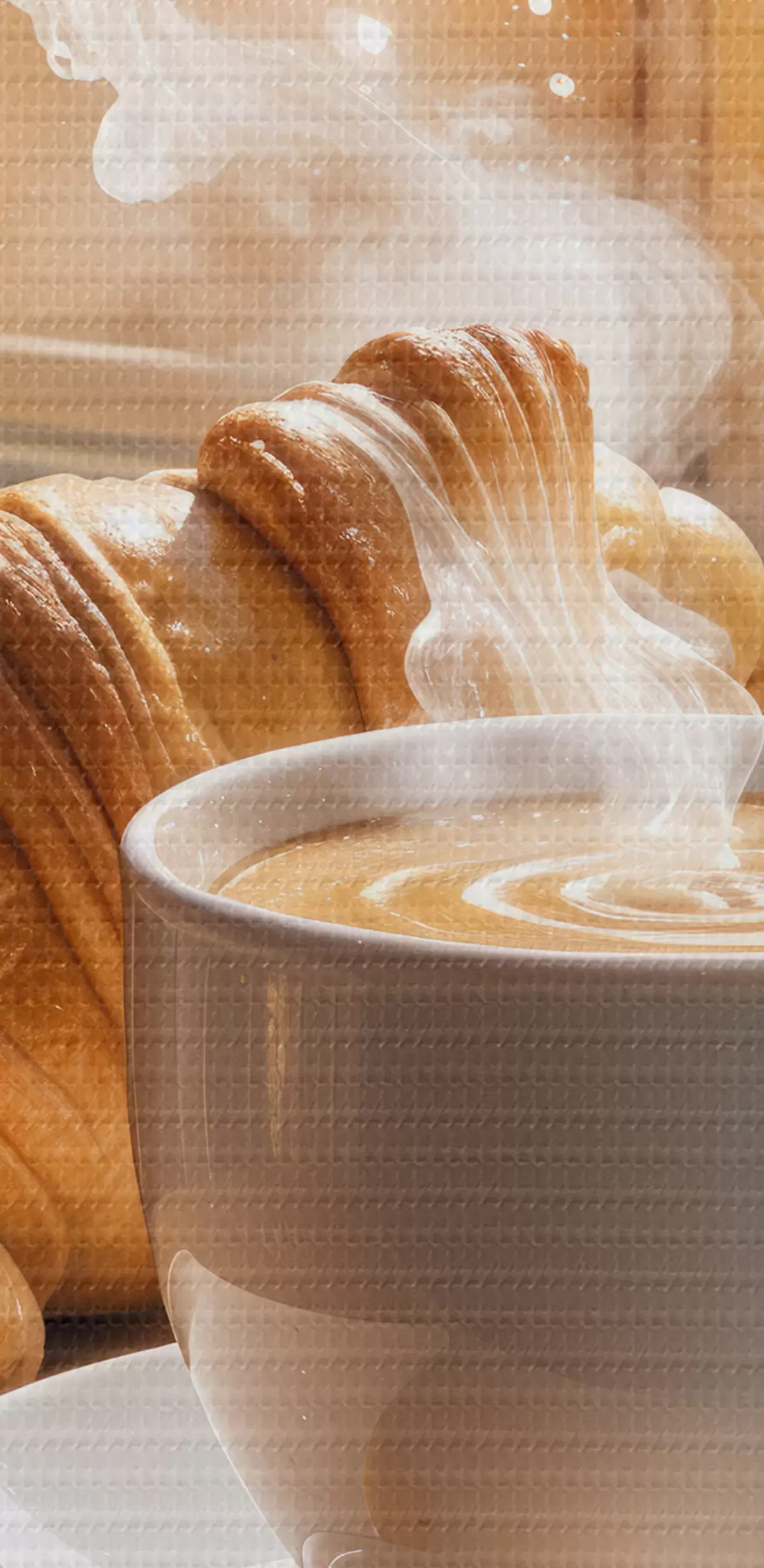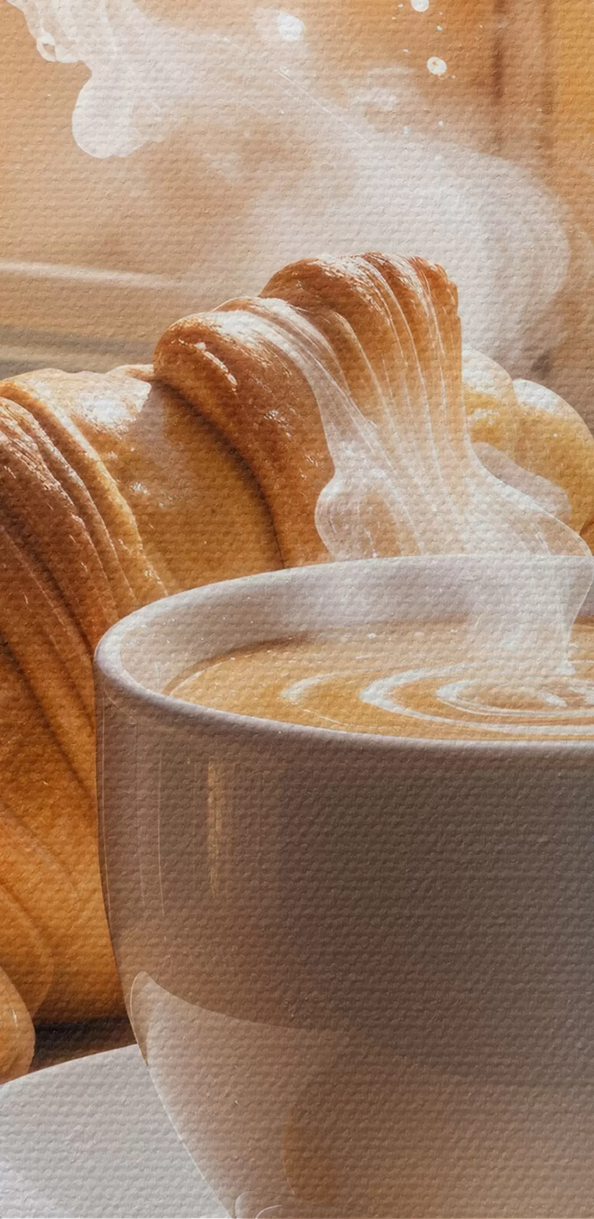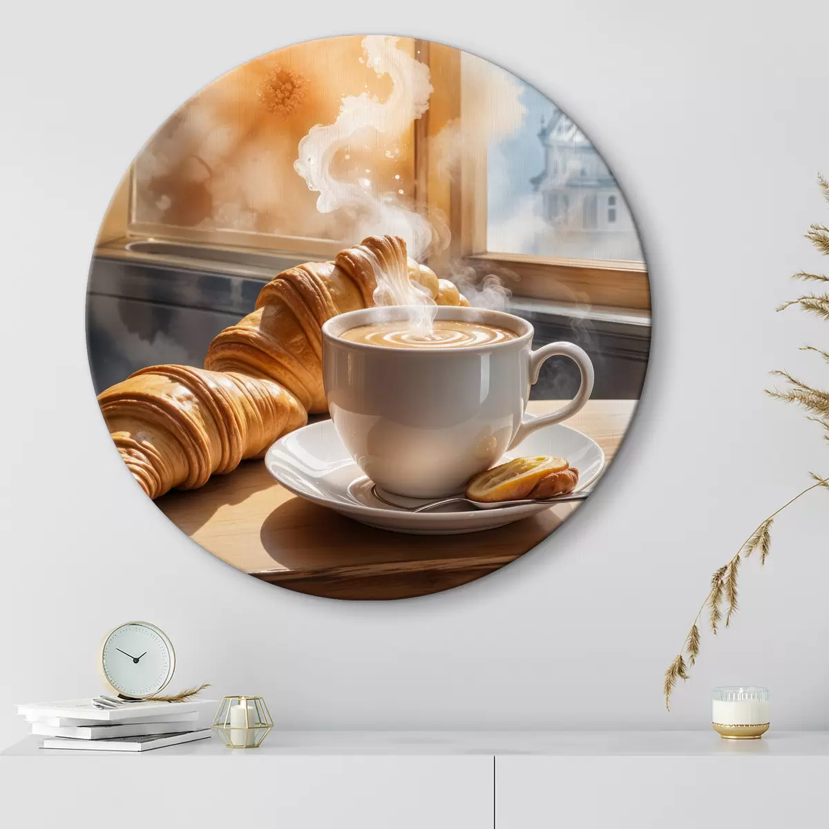 Ronde schilderijen Een warme kop koffie met opstijgende stoom, op een tafeltje naast een croissant, met uitzicht op een historisch gebouw Nr r40405