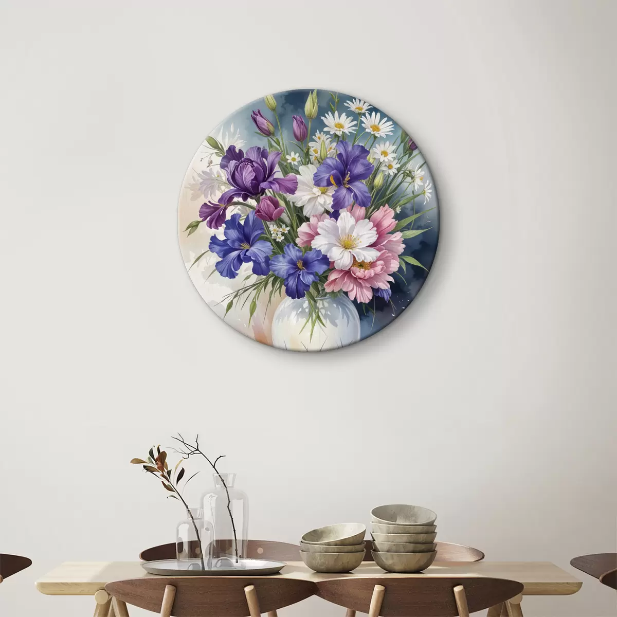 Ronde schilderijen Een levendig boeket van kleurrijke paarse irissen, roze madeliefjes en andere bloemen gerangschikt in een witte vaas Nr r40407