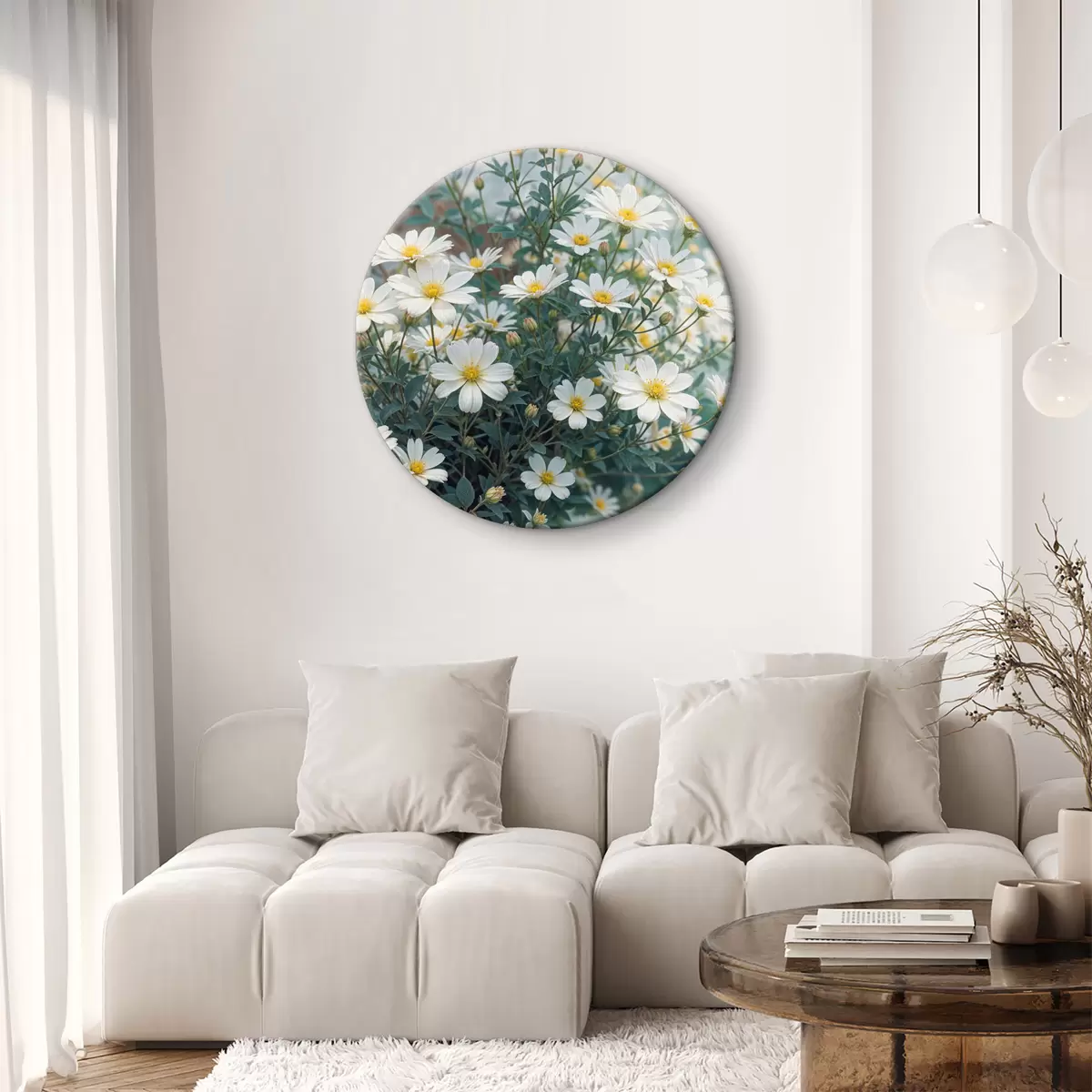 Ronde schilderijen Een veld met witte madeliefjes met groen blad, tegen een wazige achtergrond Nr r40413
