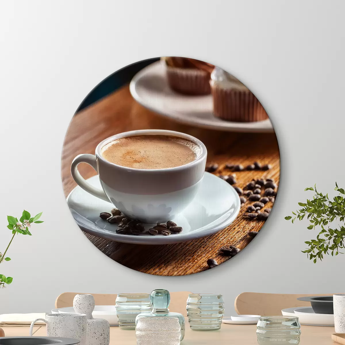 Ronde schilderijen kopje koffie, koffiebonen, taarten, stilleven Nr r40417