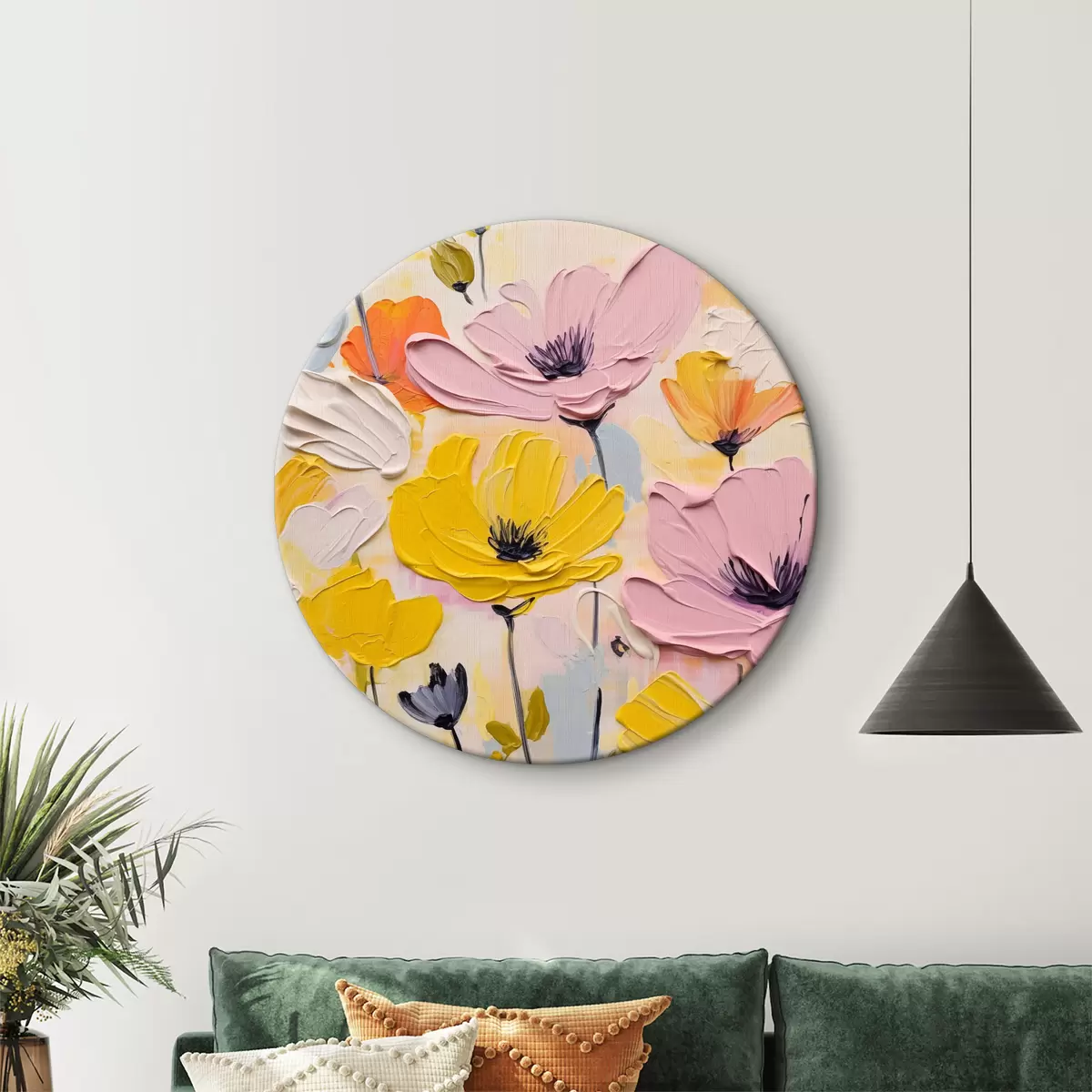 Ronde schilderijen Wilde bloemen pastelkleur, imitatie penseelstreken, geel, lila, beige, blauwe kleuren r40488