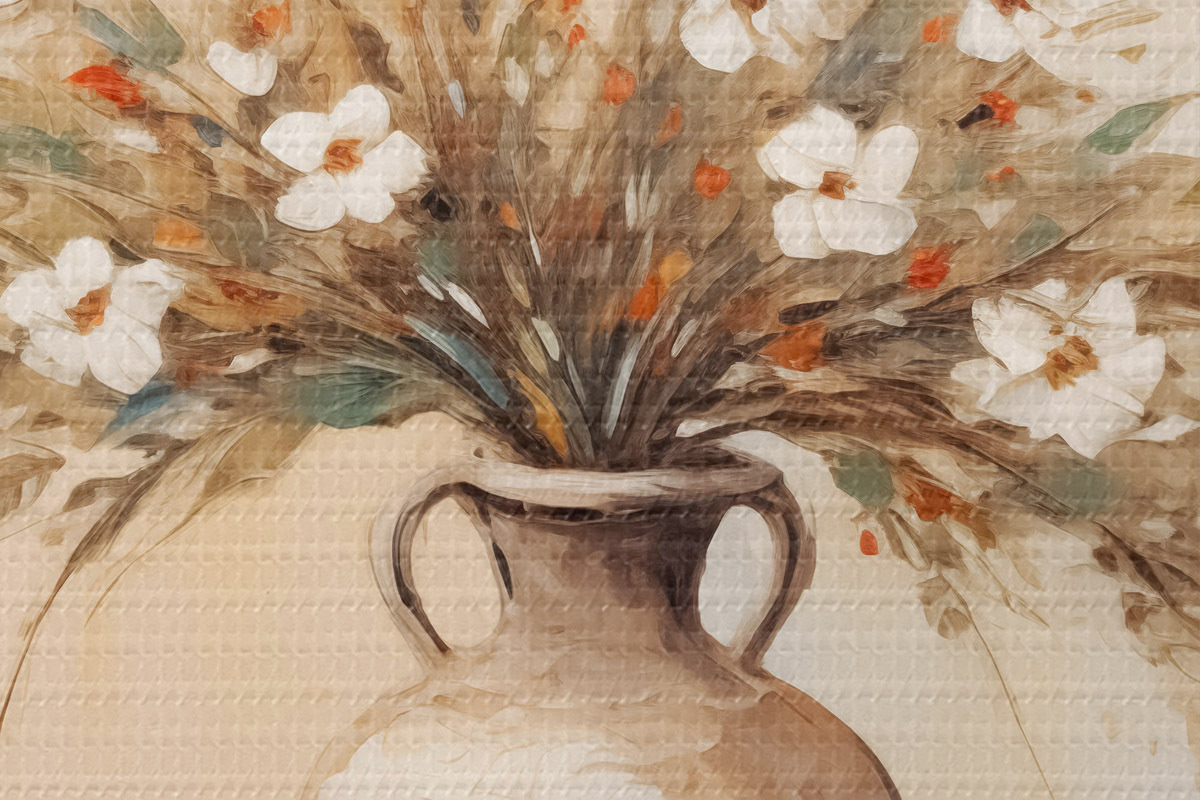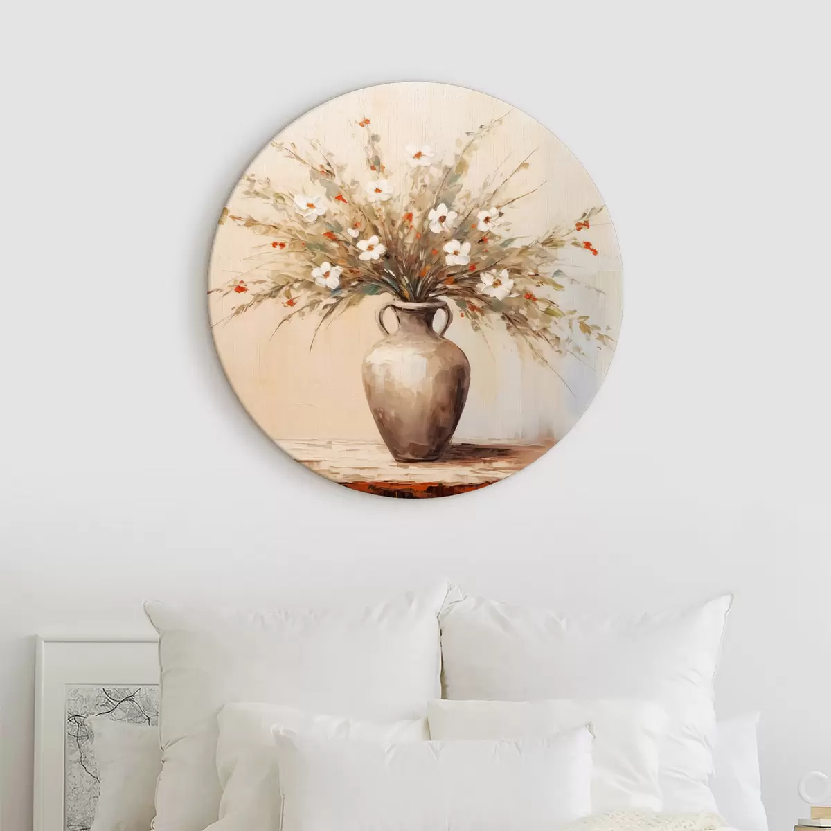 Ronde schilderijen Delicaat boeket van witte bloemen en twijgen in een antieke vaas Nr r40497