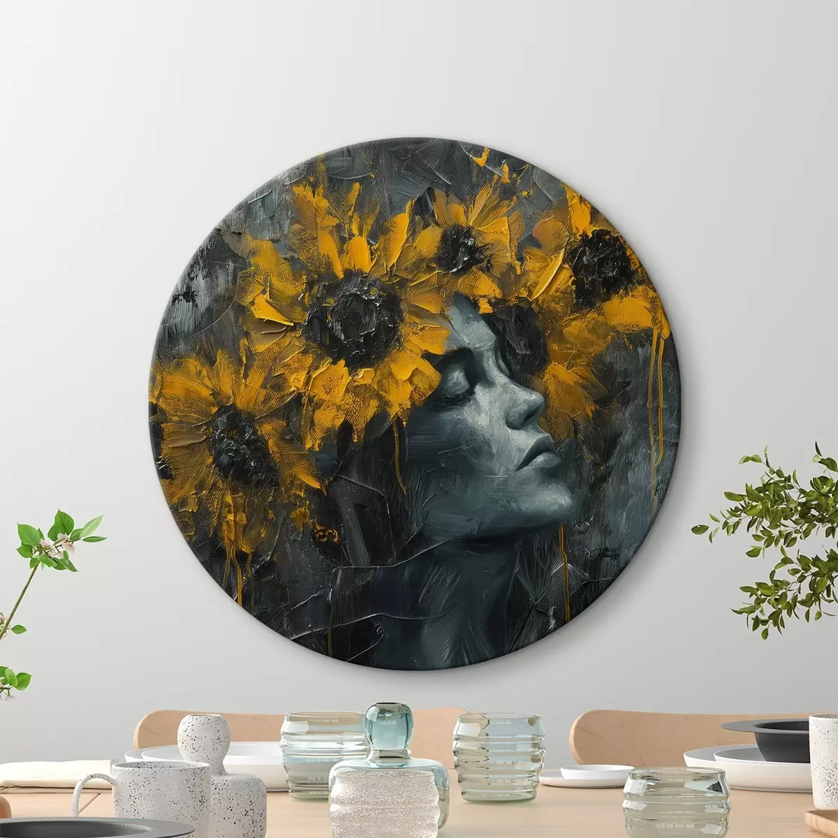 Ronde schilderijen Gezicht van vrouw in grijstinten met zonnebloemen r40500