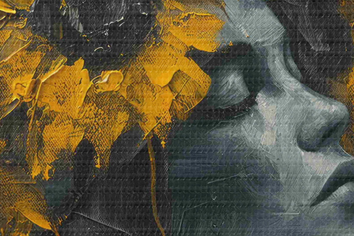 Ronde schilderijen Gezicht van vrouw in grijstinten met zonnebloemen Nr r40500