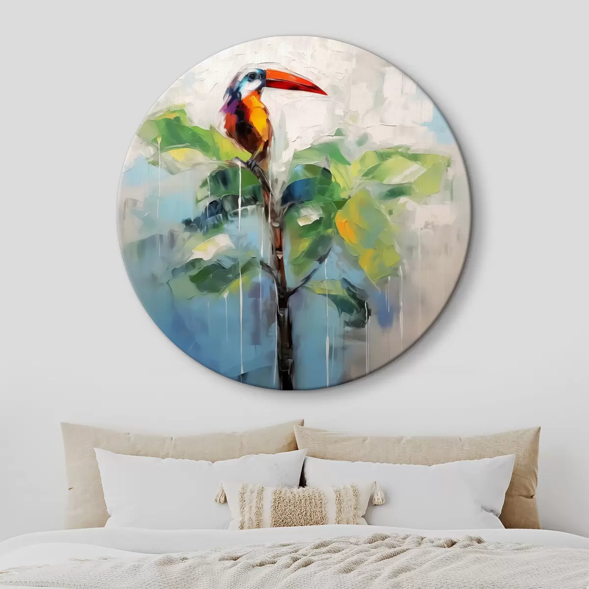 Ronde schilderijen Abstracte toekan zittend op bananenpalm, groen, blauw, grijs, geel, rode kleur Nr r40518