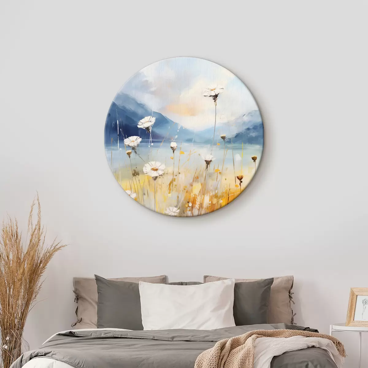 Ronde schilderijen Witte margrieten tegen de achtergrond van bergen, blauwe, gele, oranje kleuren r40522