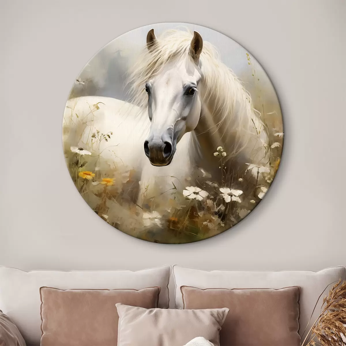 Ronde schilderijen Wit paard in het gras tussen madeliefjes r40533