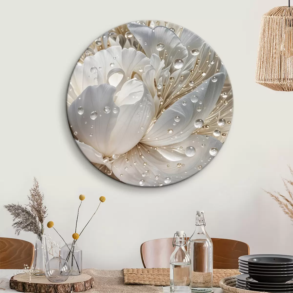 Ronde schilderijen Close-up van een witte pioenbloem met waterdruppels op de bloemblaadjes, op een onscherpe achtergrond Nr r40539