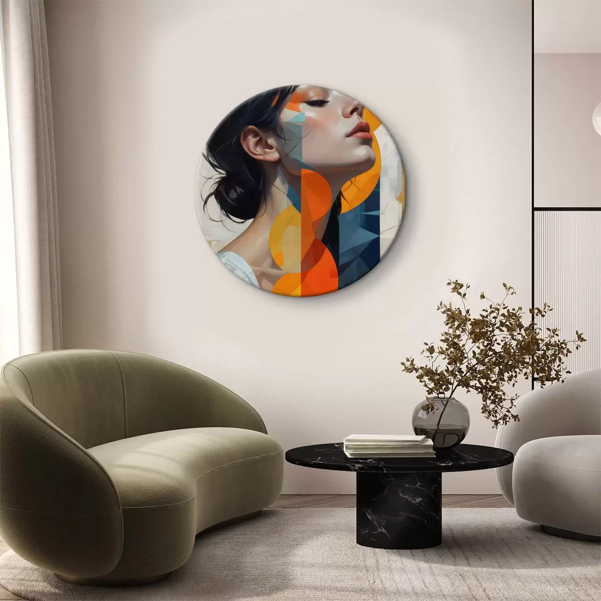 Ronde schilderijen Een abstract schilderij van een vrouw met lang, donker haar, die een wit shirt draagt met een kleurrijke, geometrische print r40543