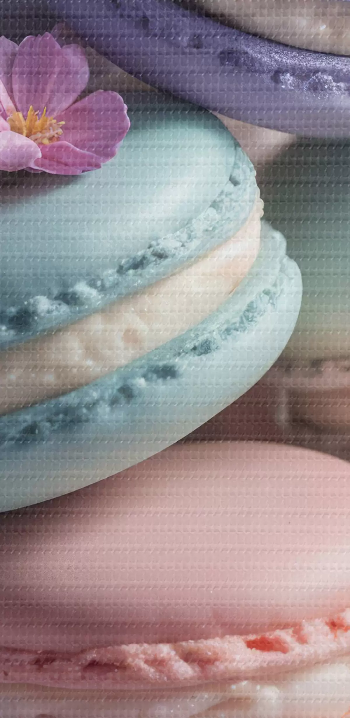 Ronde schilderijen Kleurrijke bitterkoekjes met roze en paarse bloemen op een bord, close-up r40546