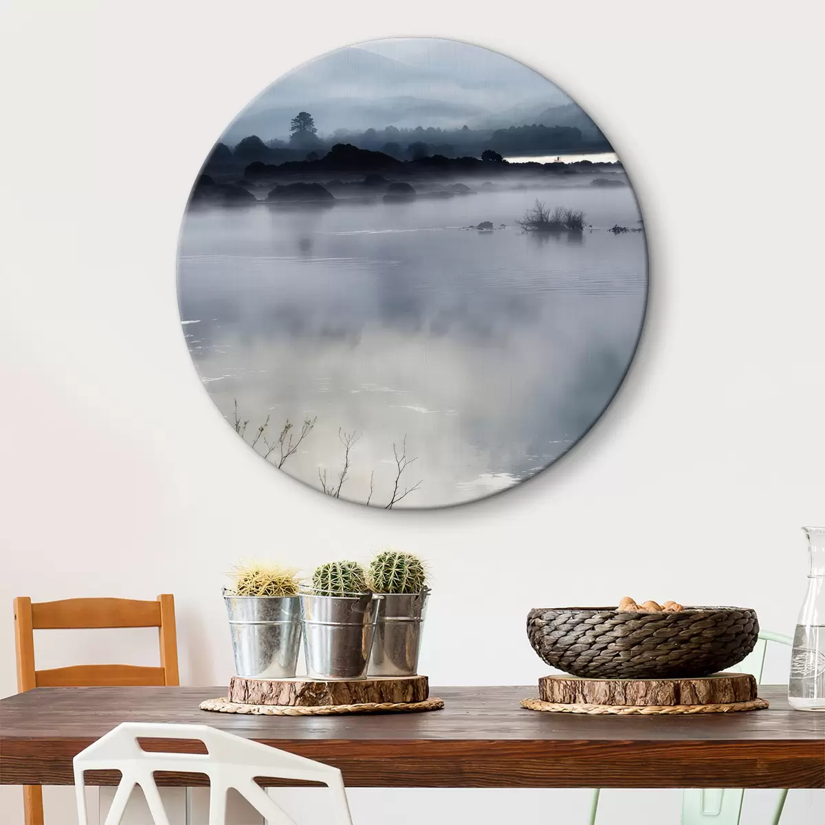 Ronde schilderijen Een mistig meer omringd door silhouetten van heuvels en bomen op de achtergrond, met een kalm, reflecterend oppervlak r40552