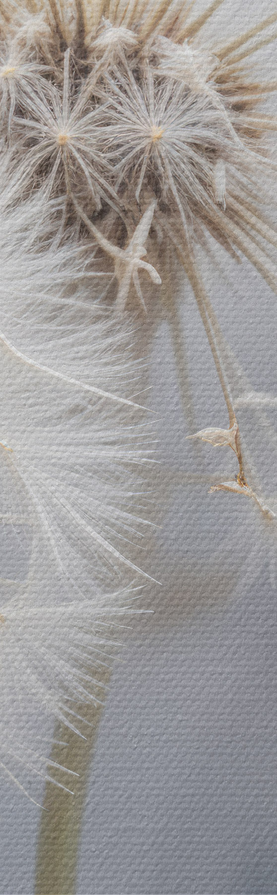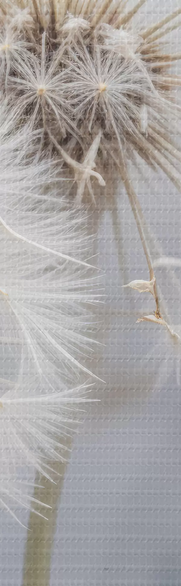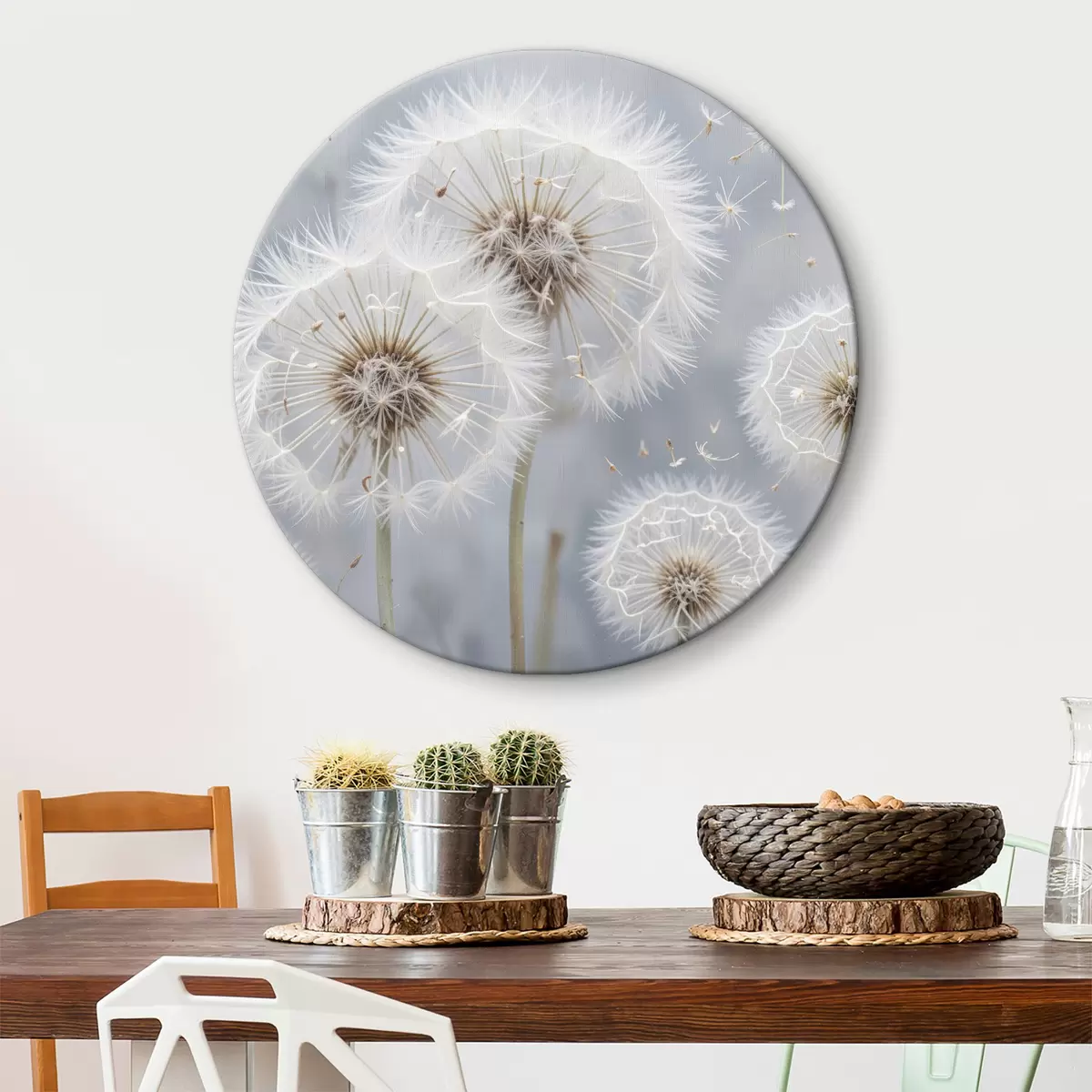 Ronde schilderijen Witte paardenbloem bloemen met pluizige zaden op een wazige grijze achtergrond Nr r40556