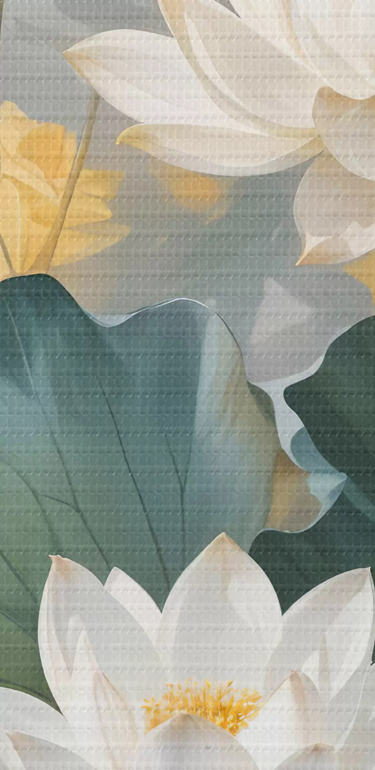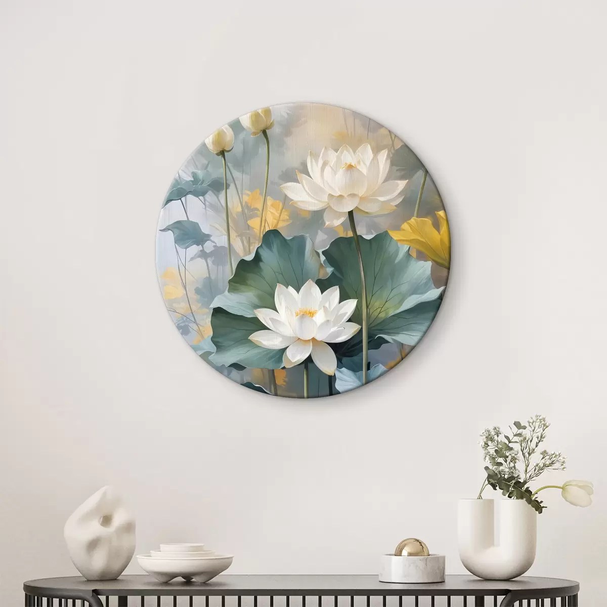 Ronde schilderijen Witte lotusbloemen in een vijver met groene waterlelieblaadjes, omringd door gele bloemen en wazige achtergrond Nr r40559