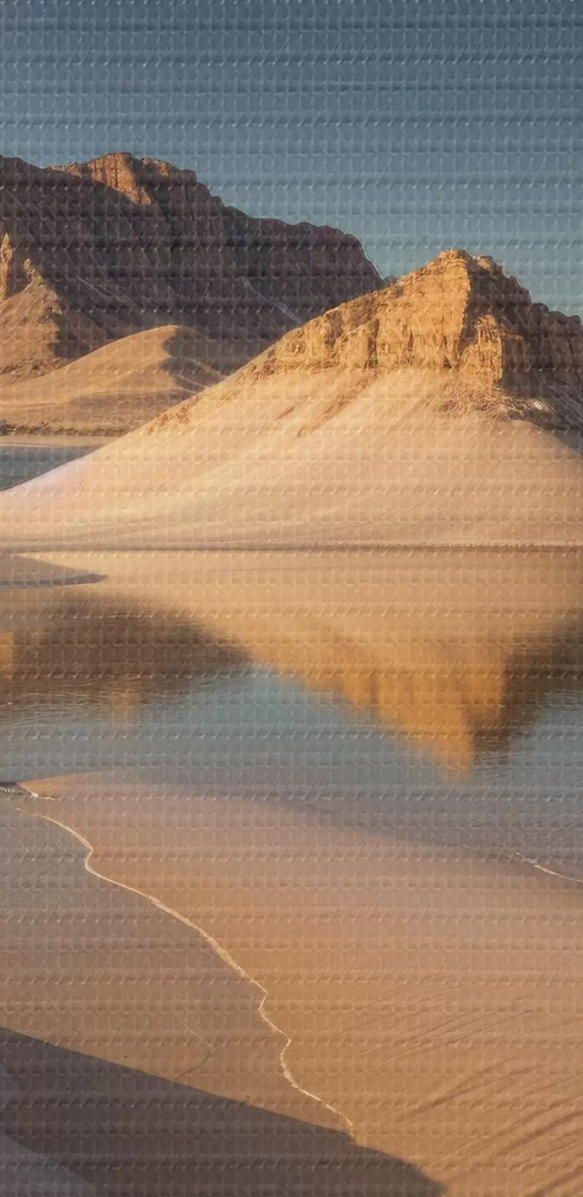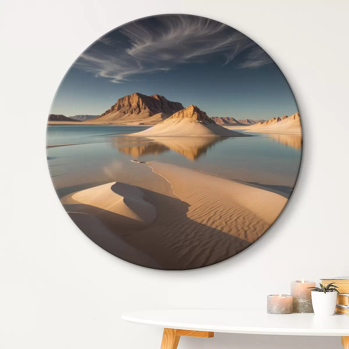 Ronde schilderijen Een uitgestrekt woestijnlandschap met hoge rotsformaties die weerspiegeld worden in het ondiepe water Nr r40568