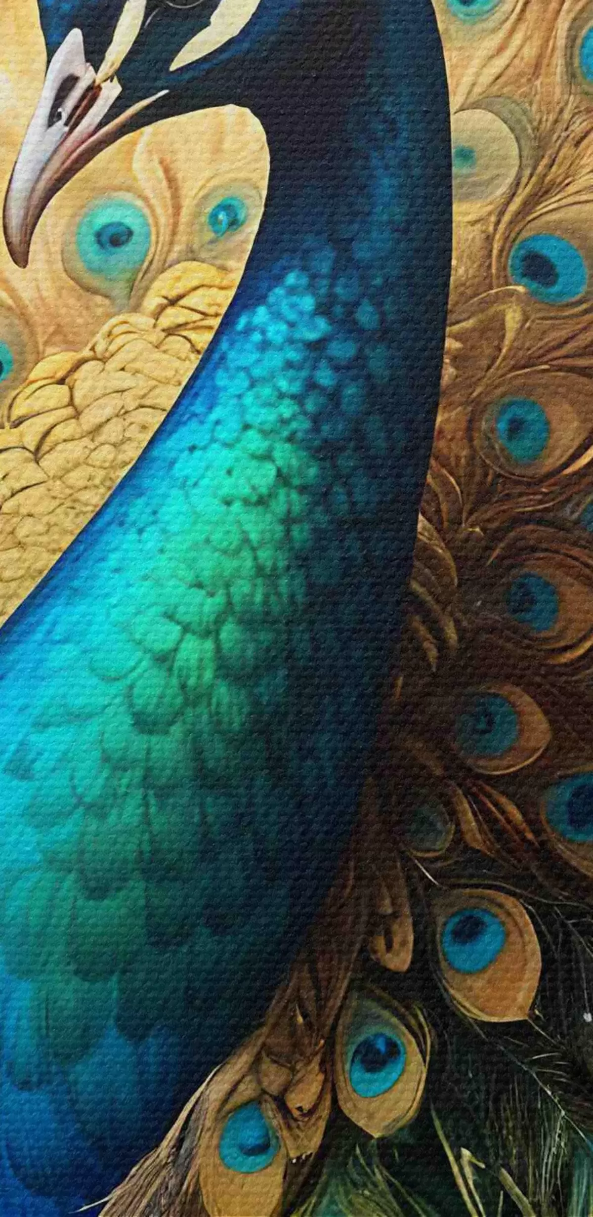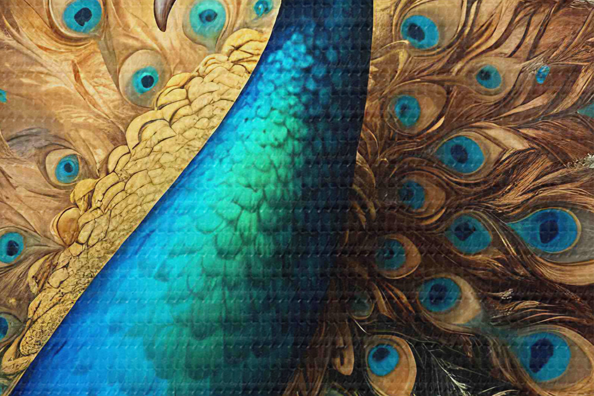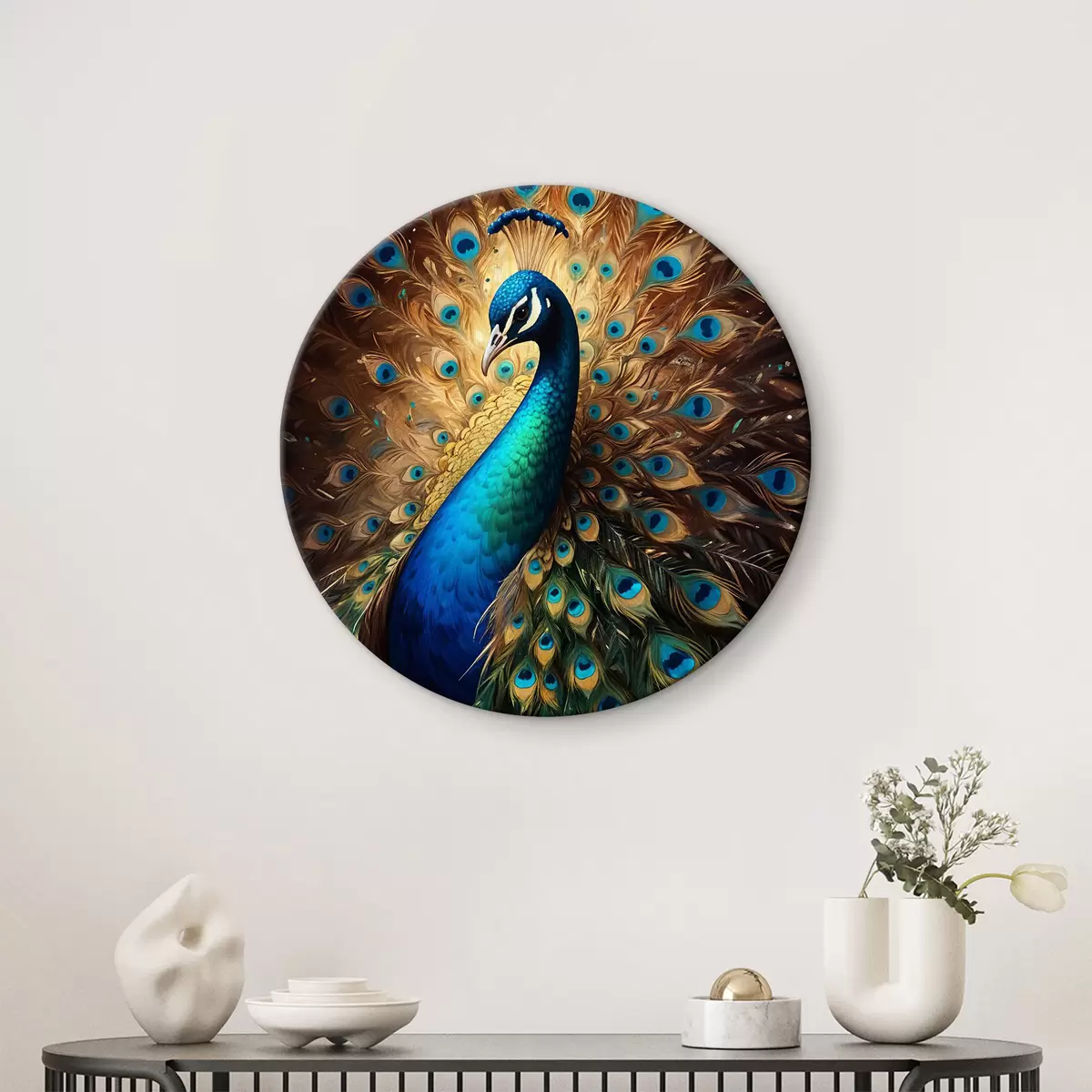 Ronde schilderijen Een levendige pauw met volledig ontblote veren en een prachtig blauw en groen verenkleed Nr r40571