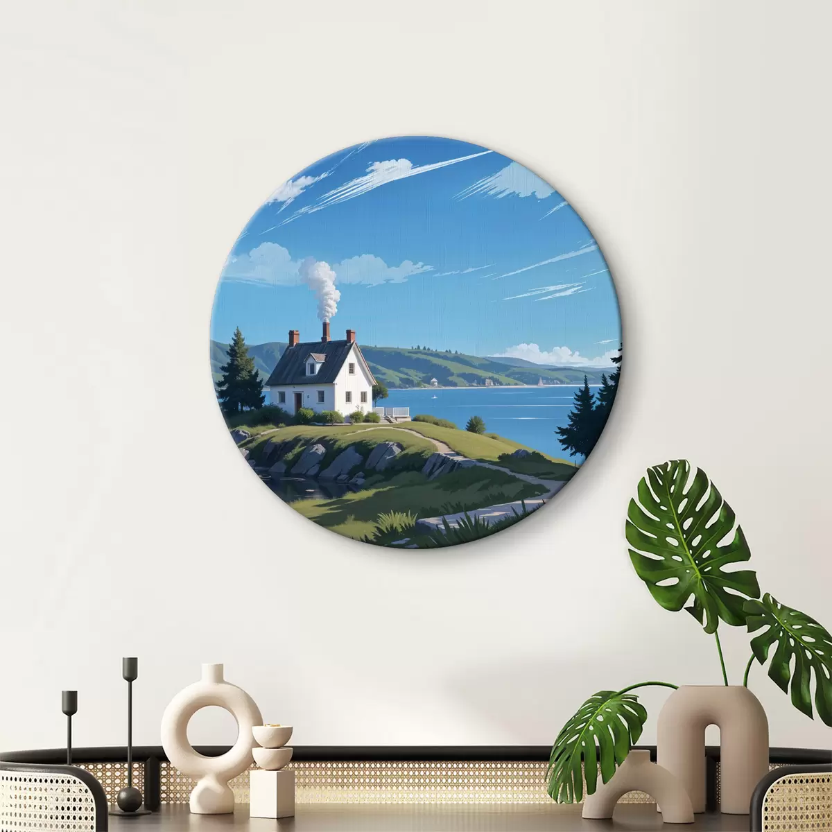 Ronde schilderijen Een wit huis op een met gras begroeide heuvel met bergen op de achtergrond en een blauwe lucht met gezwollen wolken Nr r40587