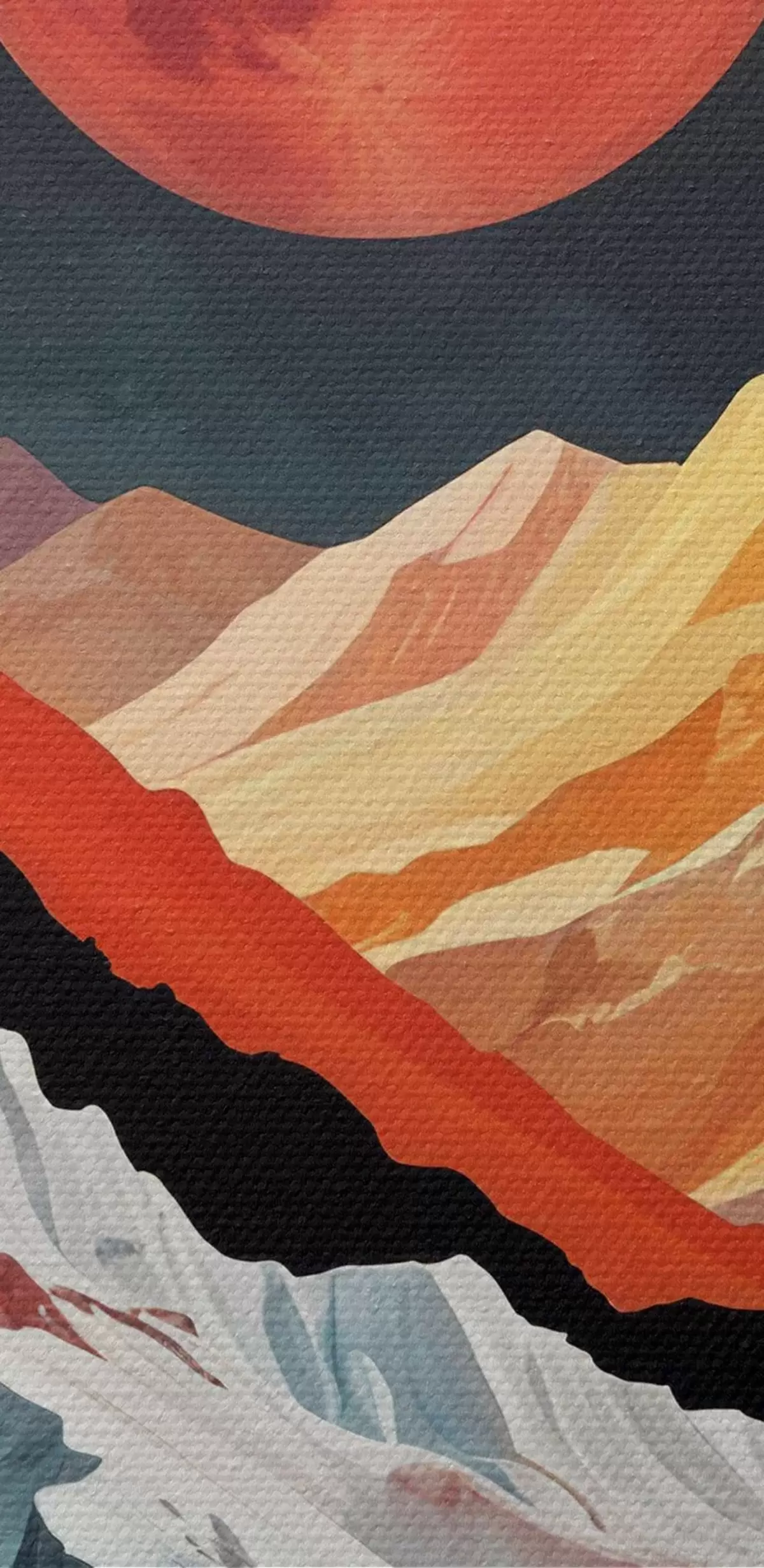 Ronde schilderijen Surrealistisch landschap met hoge grillige bergen onder een grote oplichtende rode maan in een donkere bewolkte lucht Nr r40589