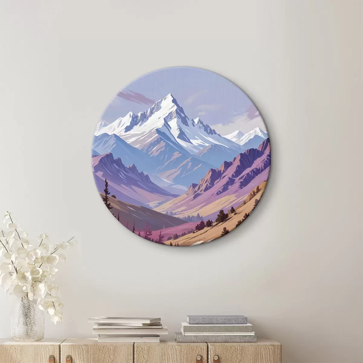 Ronde schilderijen Besneeuwde bergtoppen in een kleurrijk landschap met pijnbomen op de voorgrond Nr r40595
