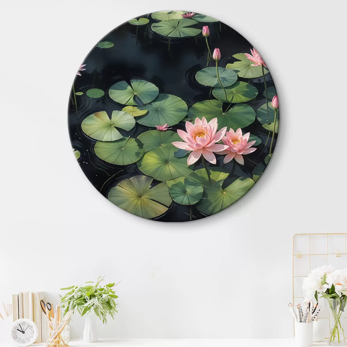 Ronde schilderijen Een vijver met roze waterlelies en groene lelieblaadjes drijvend op het oppervlak, omgeven door een donkere achtergrond Nr r40598