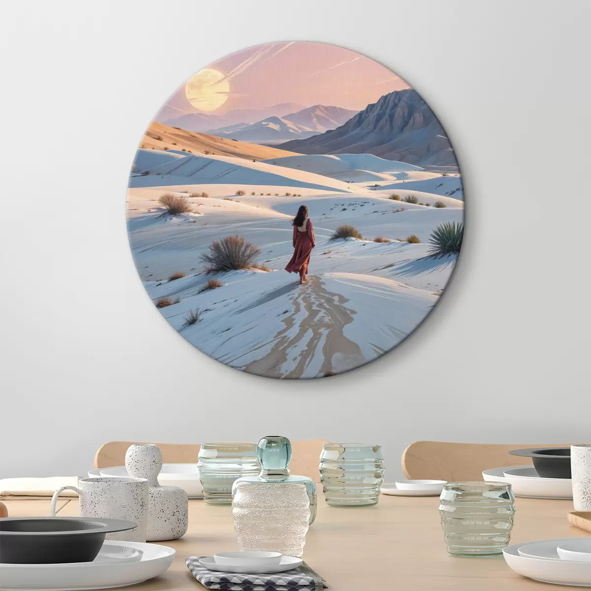 Ronde schilderijen Vrouw in een rode jurk in een woestijnlandschap met een berg op de achtergrond en duinen r40603