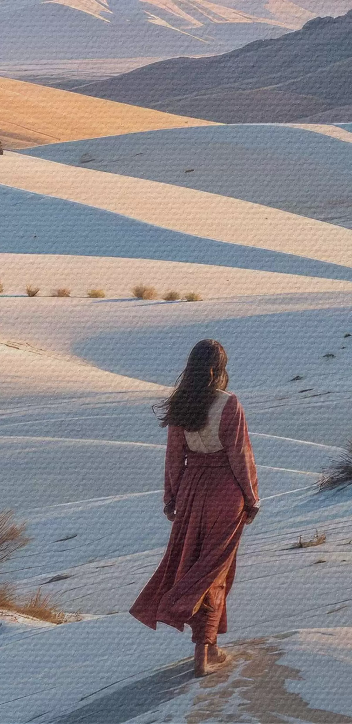 Ronde schilderijen Vrouw in een rode jurk in een woestijnlandschap met een berg op de achtergrond en duinen Nr r40603