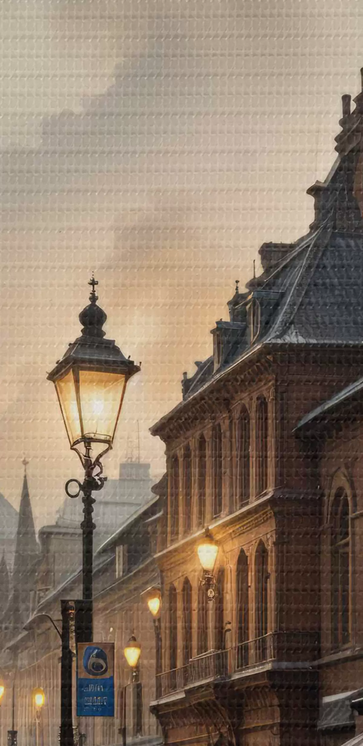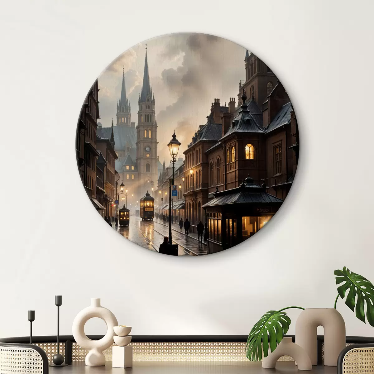Ronde schilderijen Regenachtige avond in een oude Europese stad, met geplaveide straten, historische gebouwen en een passerende tram Nr r40604