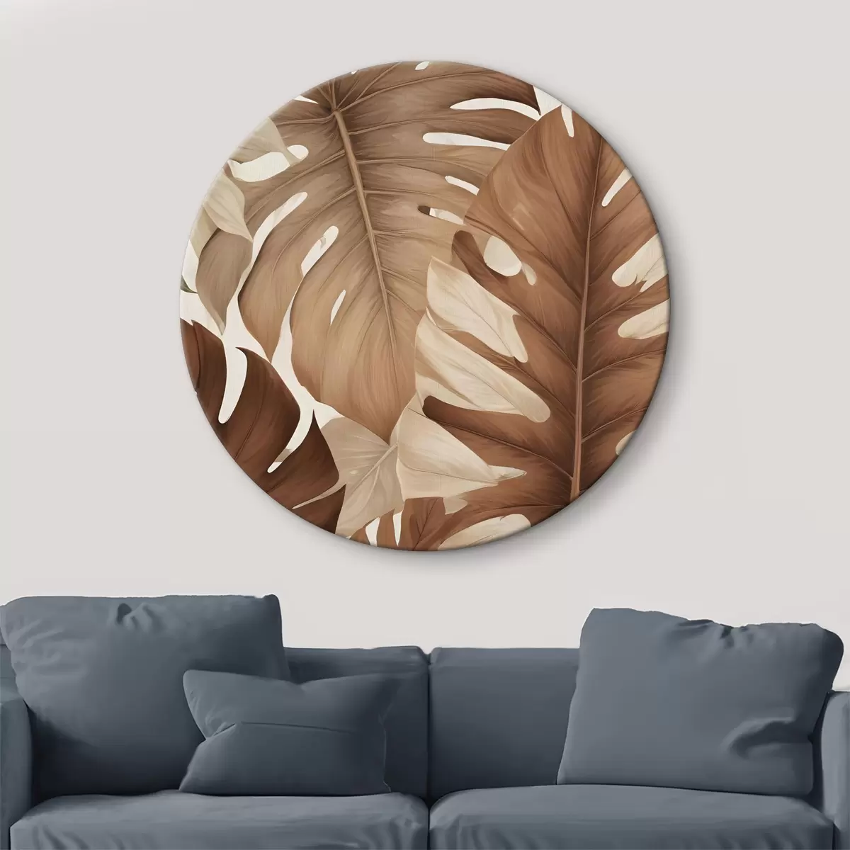 Ronde schilderijen Een print van tropische bladeren met een natuurlijke, organische textuur in bruin- en beigetinten Nr r40613