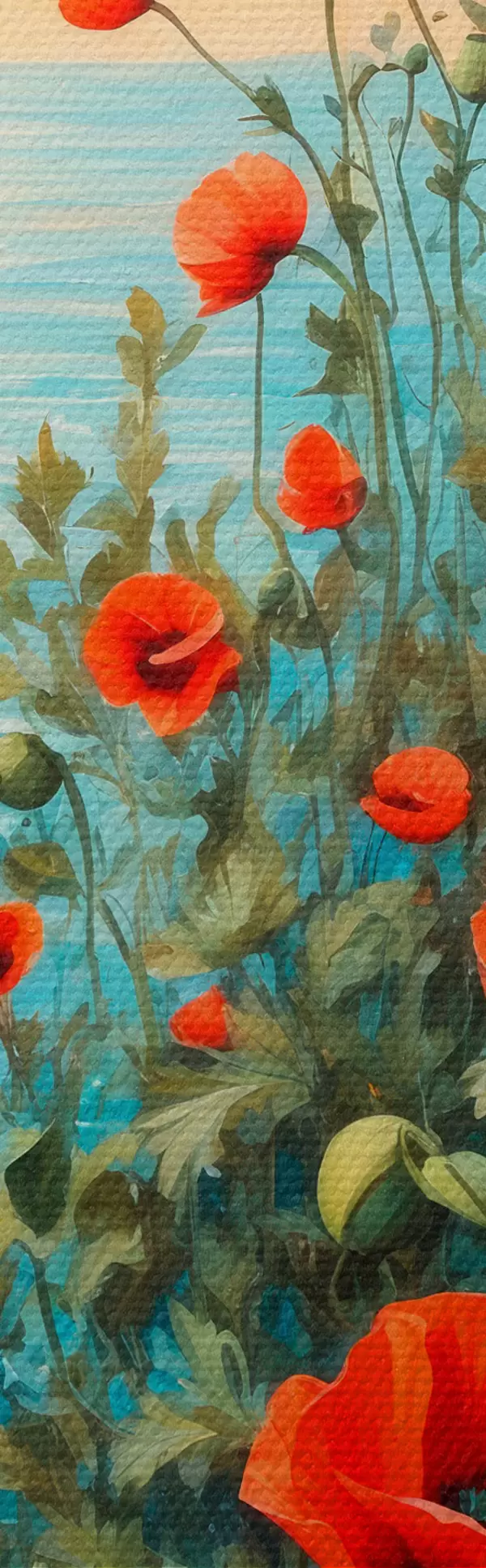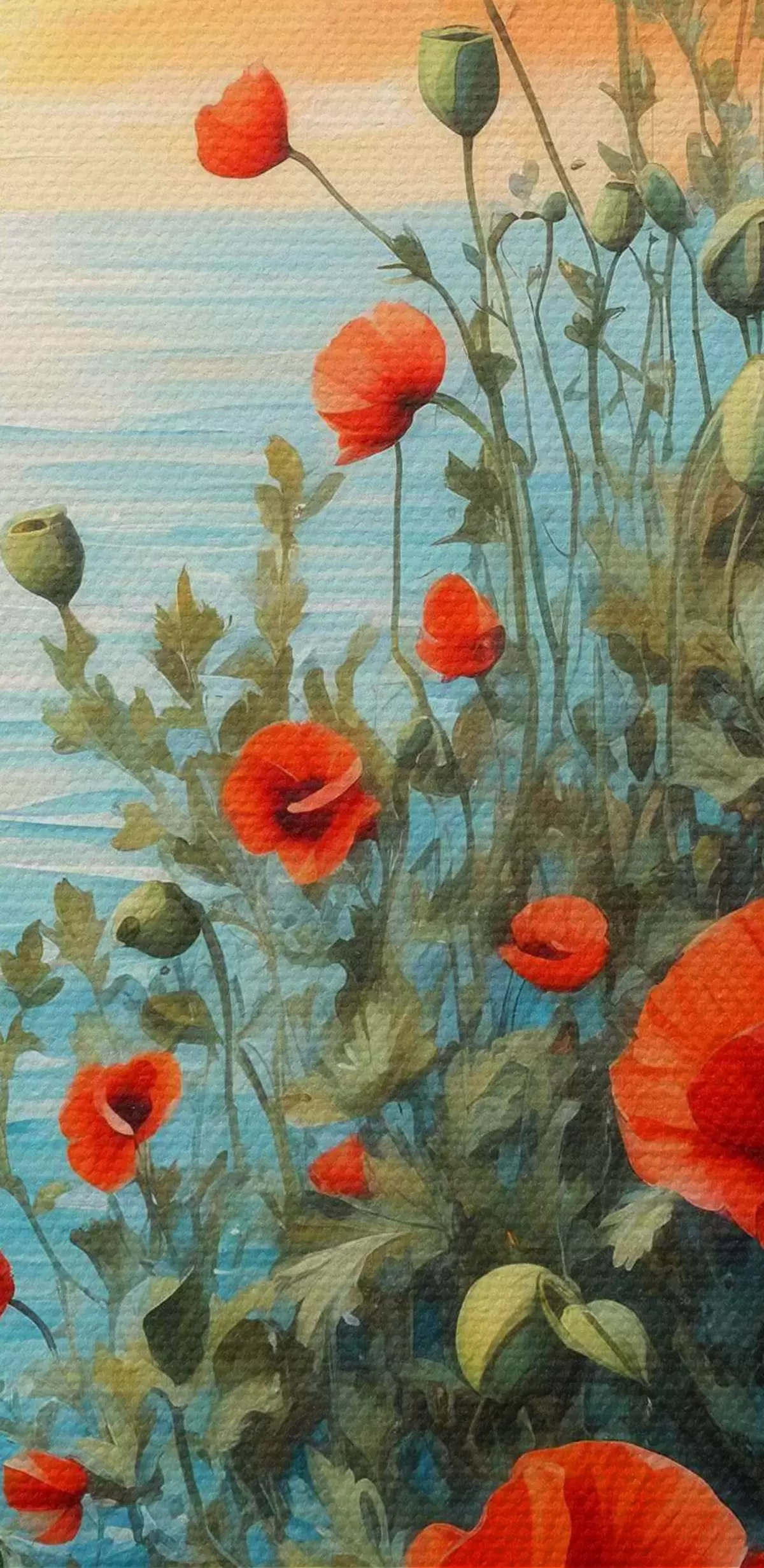 Ronde schilderijen Bloeiende klaprozen tegen de achtergrond van de zee Nr r40637