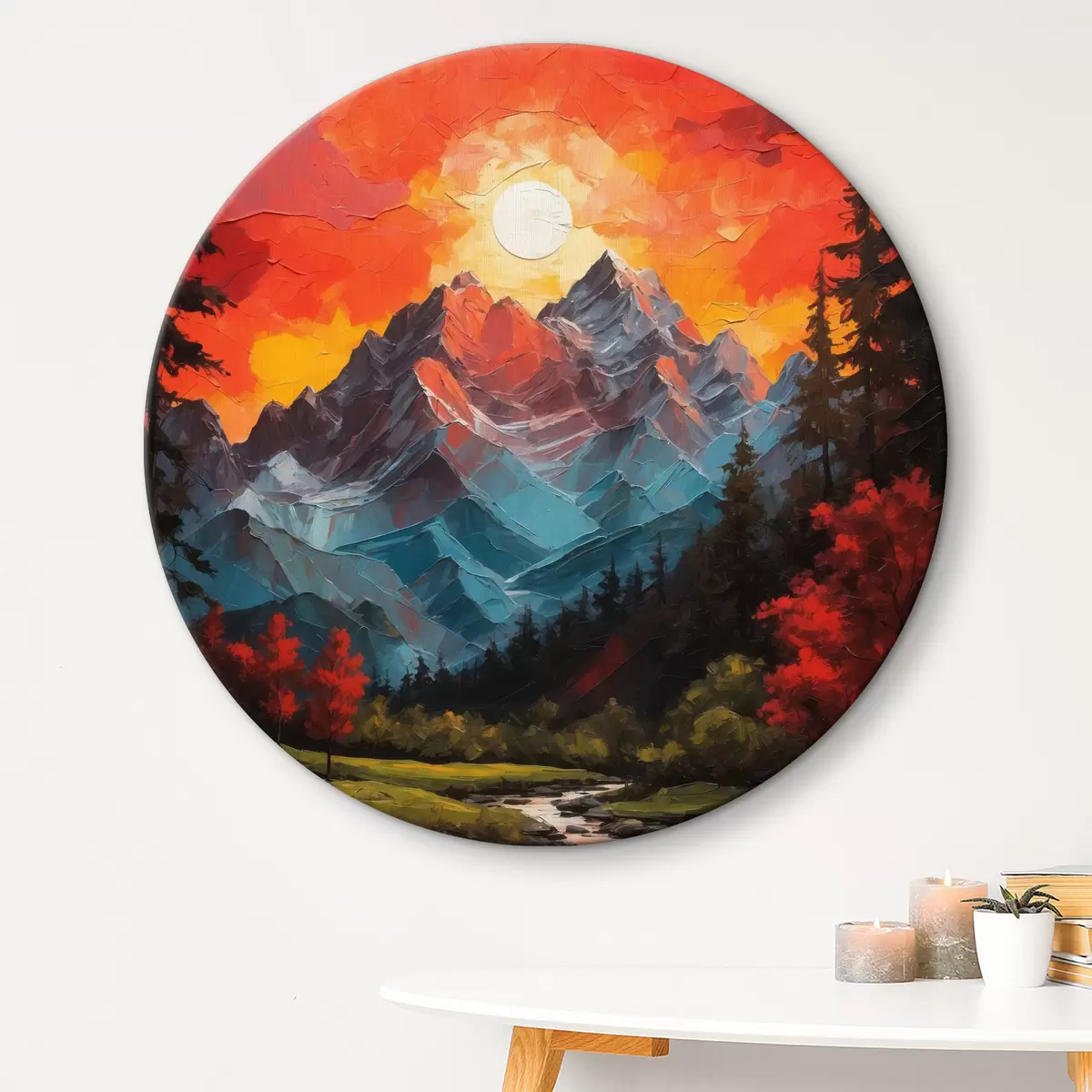 Ronde schilderijen Bergen en rode lucht bij zonsondergang Nr r40641