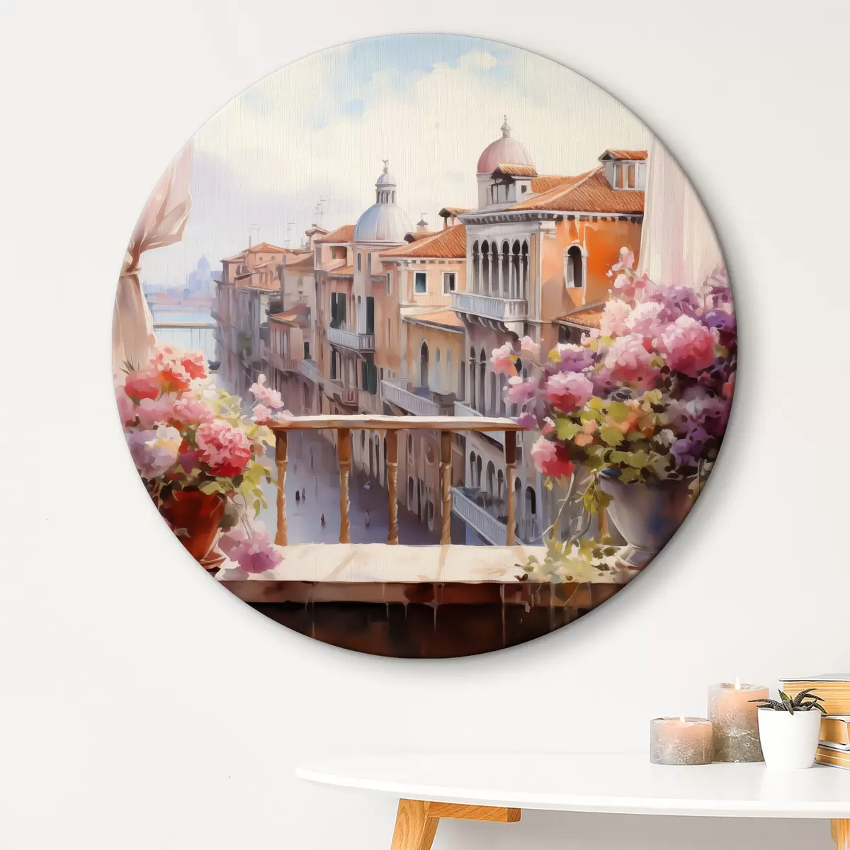 Ronde schilderijen Bloemen in vazen met uitzicht op de baai in Venetië aquarel r40677