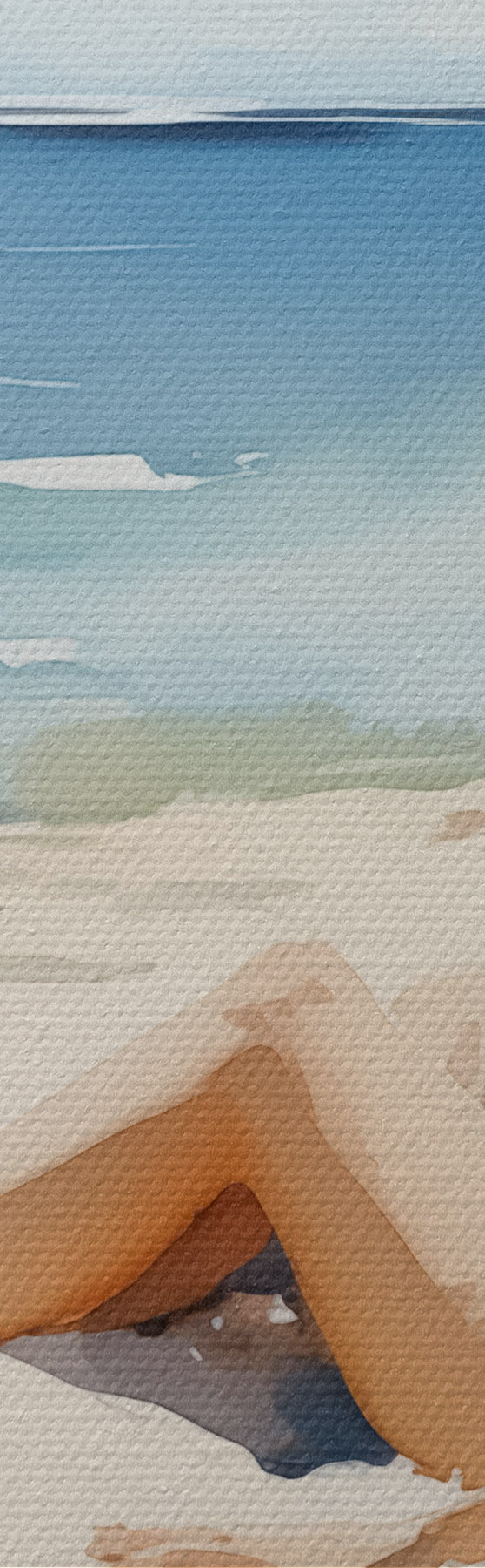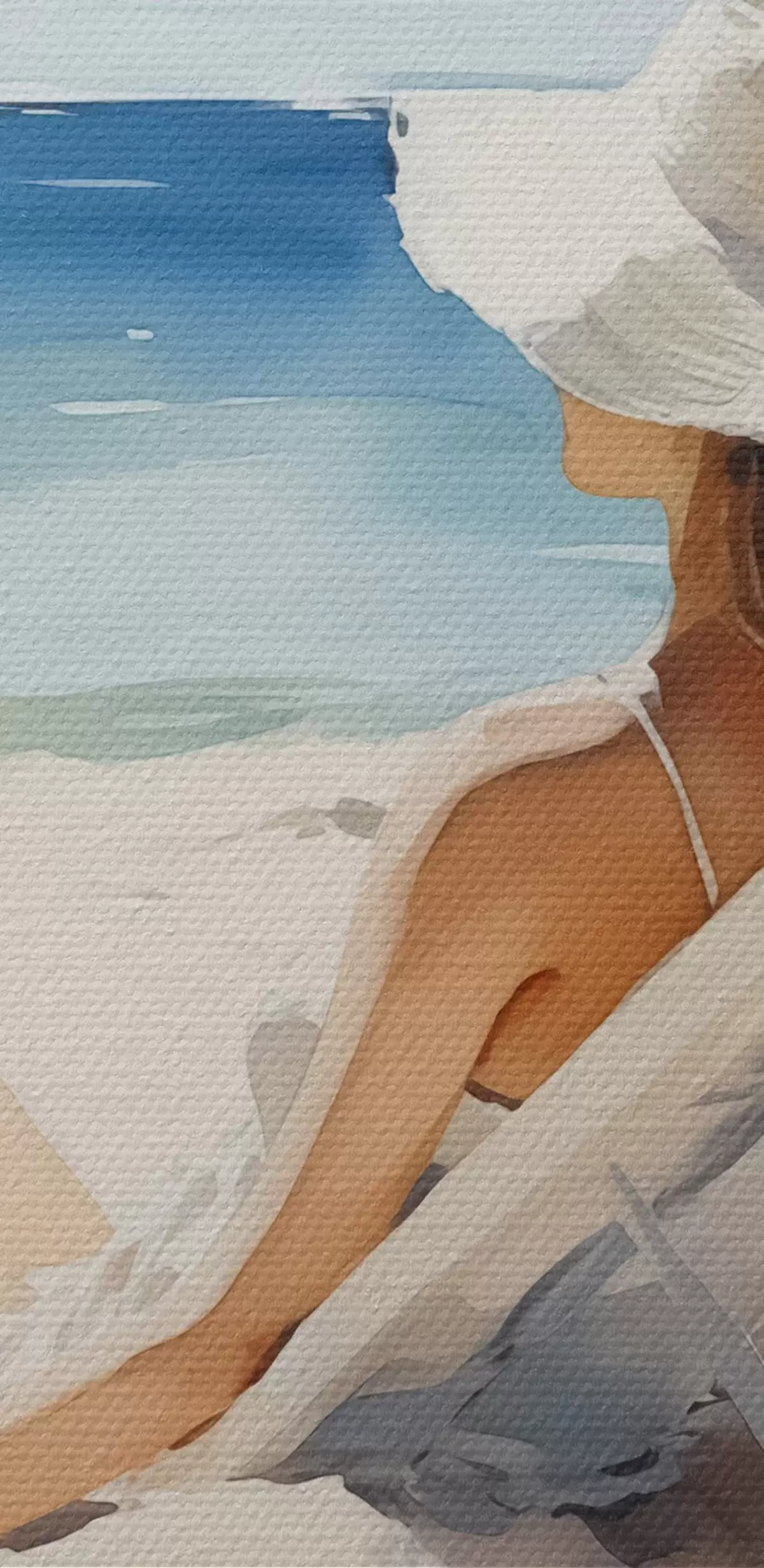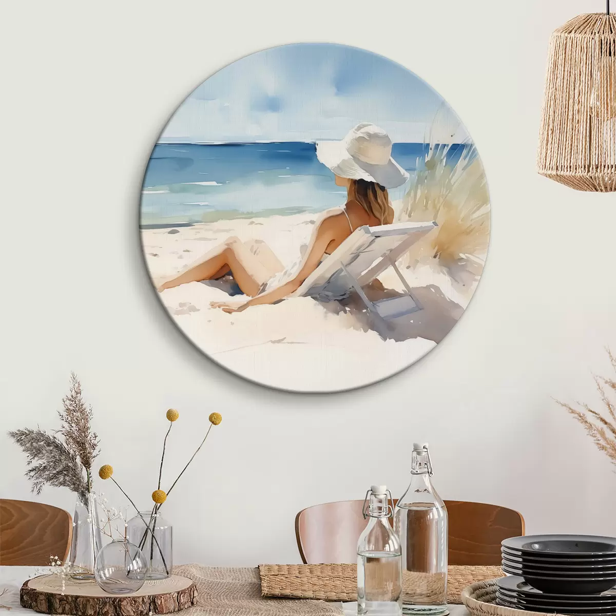 Ronde schilderijen Meisje ontspannend op het strand bij de zee aquarel r40679