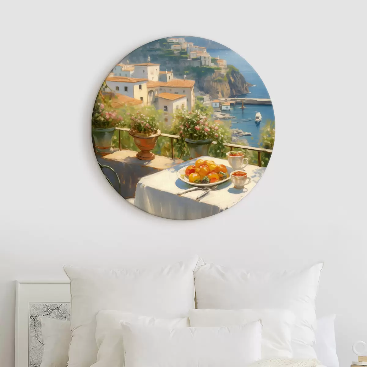 Ronde schilderijen Sinaasappels in een bord op een tafel met uitzicht op de zee en de stad Nr r40719