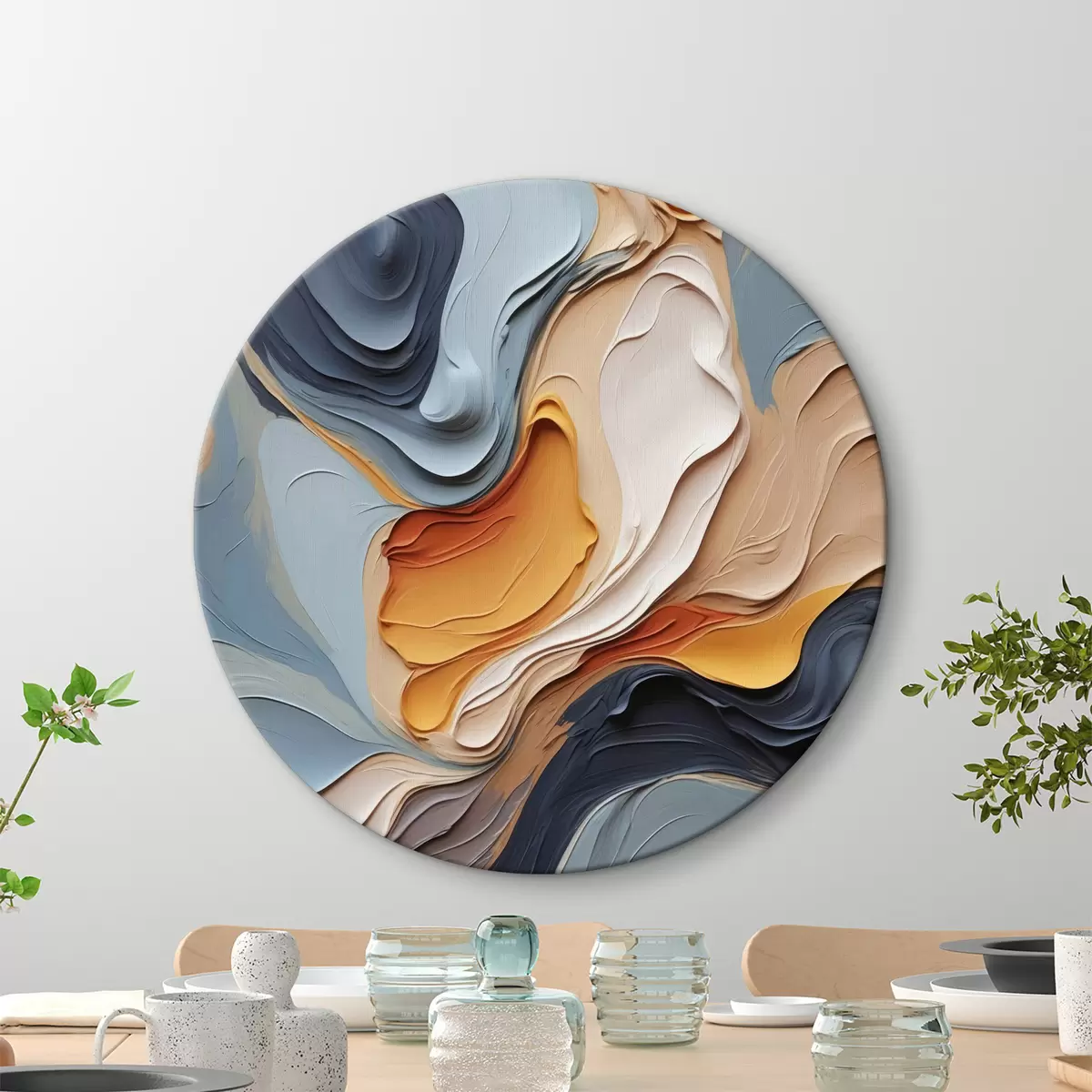 Ronde schilderijen Abstractie in blauw- en oranjetinten met textuurimitatie r40743