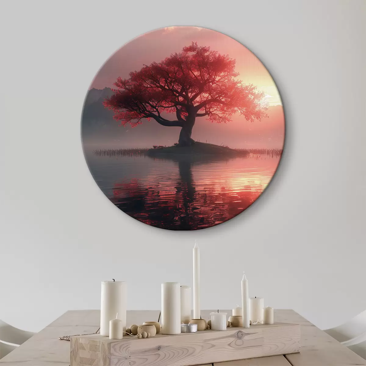 Ronde schilderijen Boom bij de vijver bij zonsondergang Nr r40934