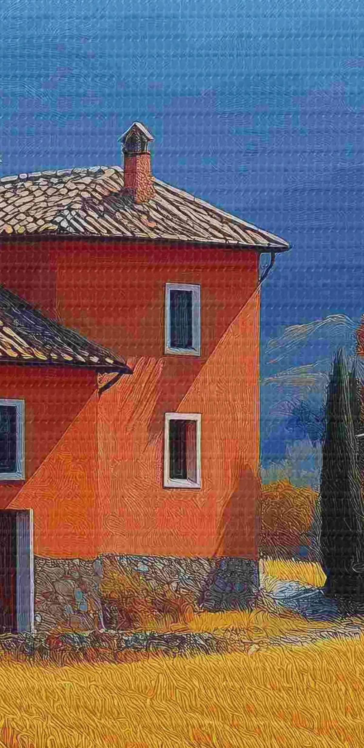 Ronde schilderijen Een huisje in een veld met herfstige bergen op de achtergrond Nr r40962