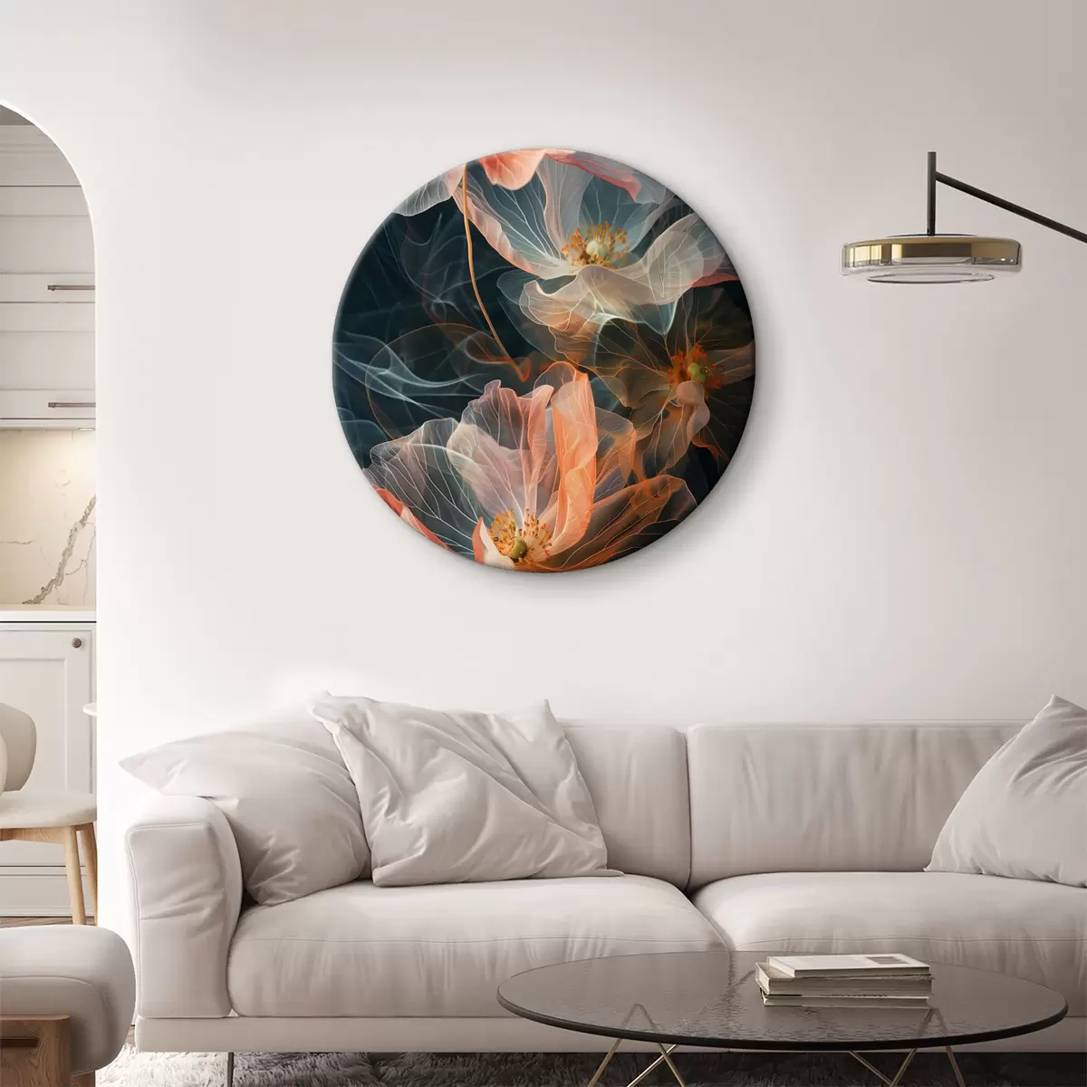 Ronde schilderijen Heldere, doorschijnende bloemen gehuld in rook op een donkere achtergrond r40968