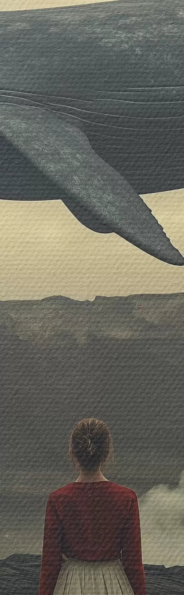 Ronde schilderijen Meisje op lava met een grote vliegende walvis in de lucht Nr r40986