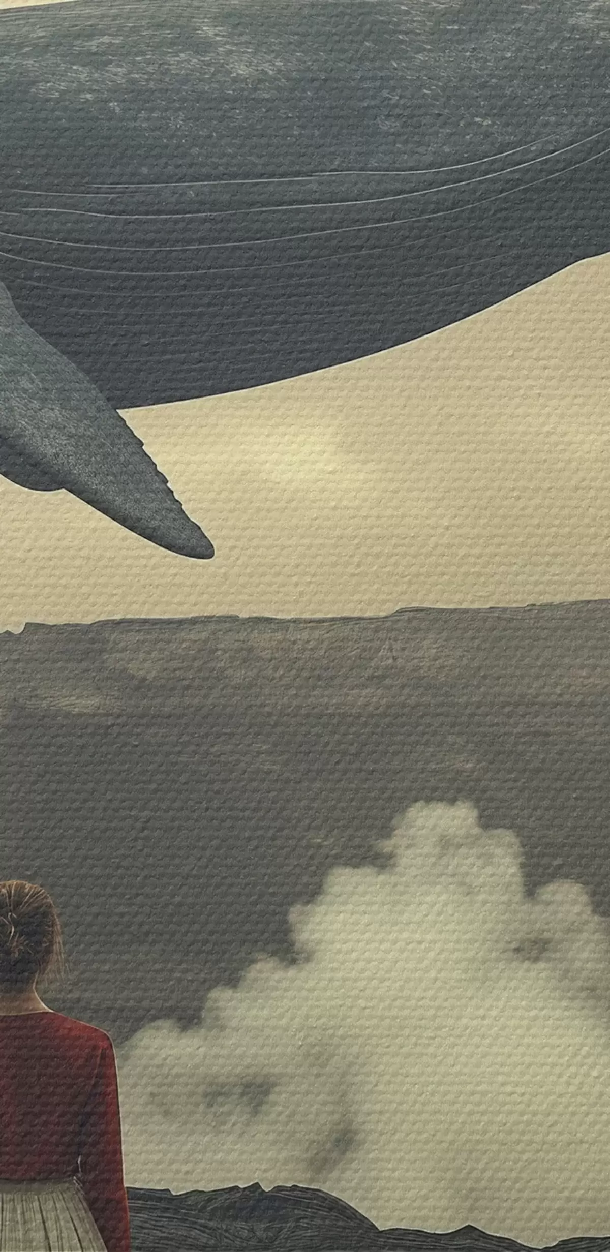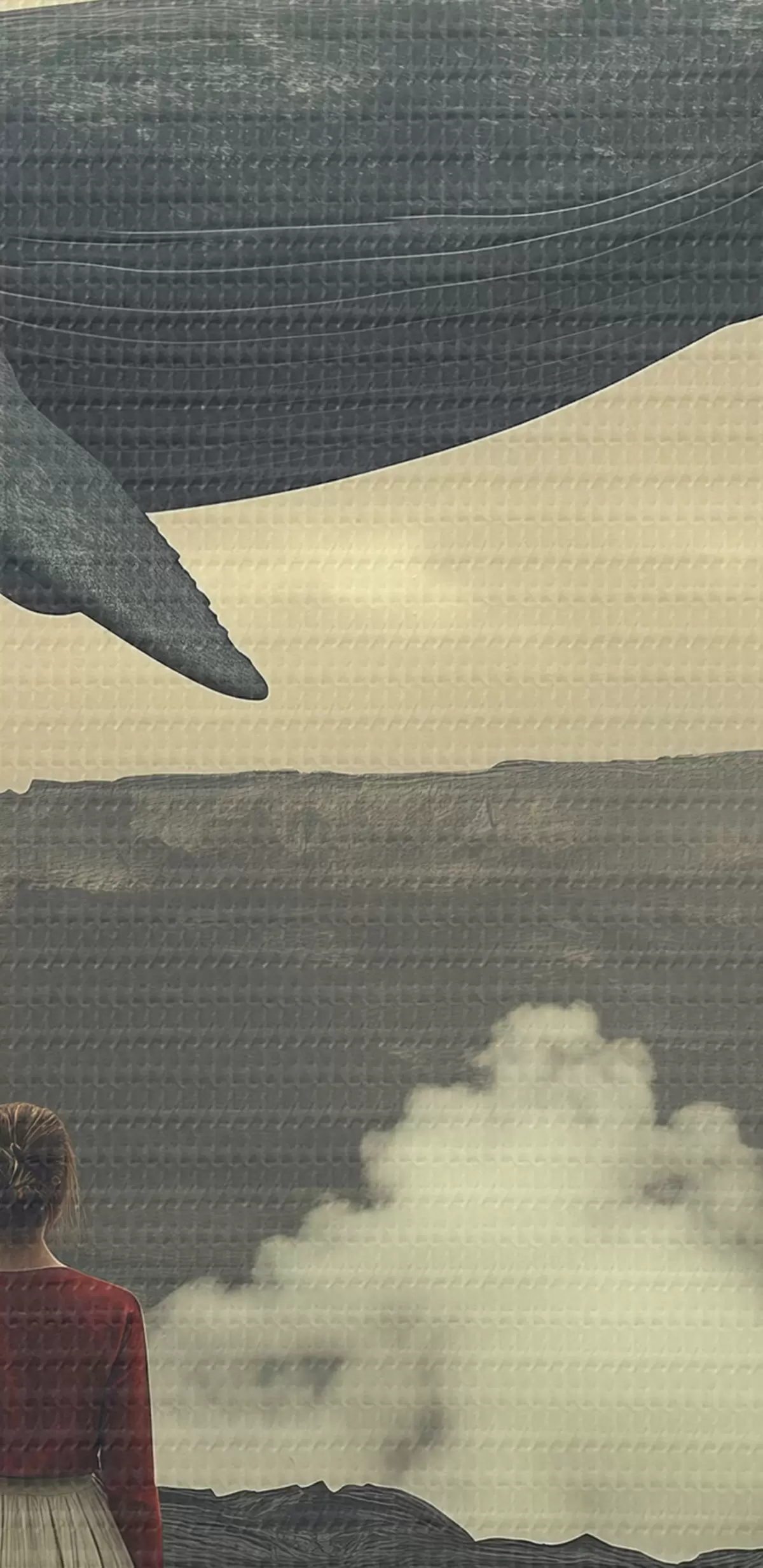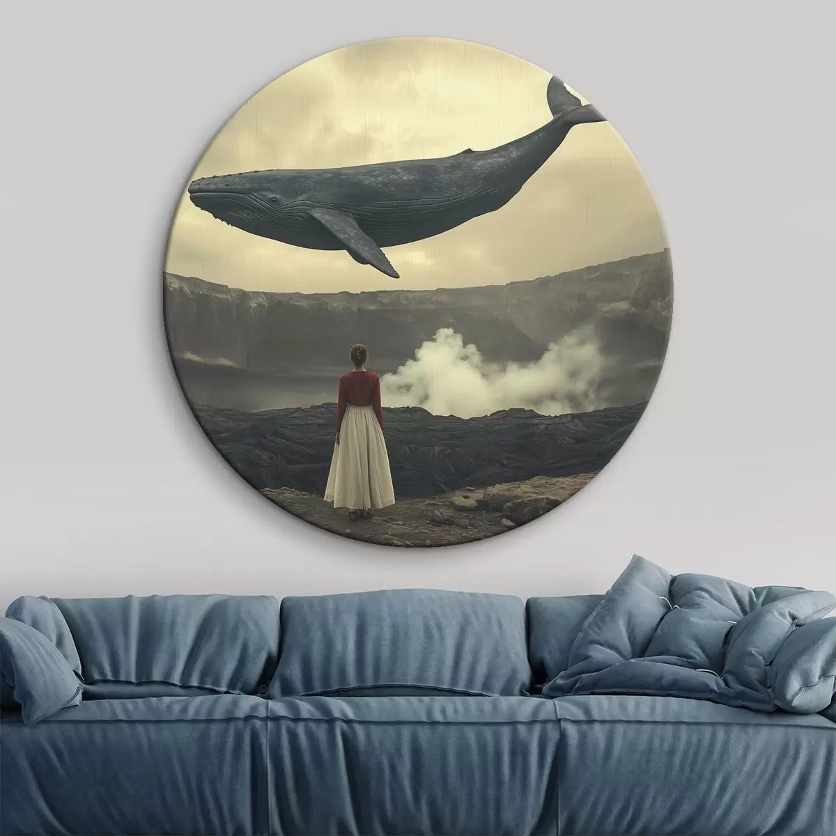 Ronde schilderijen Meisje op lava met een grote vliegende walvis in de lucht Nr r40986