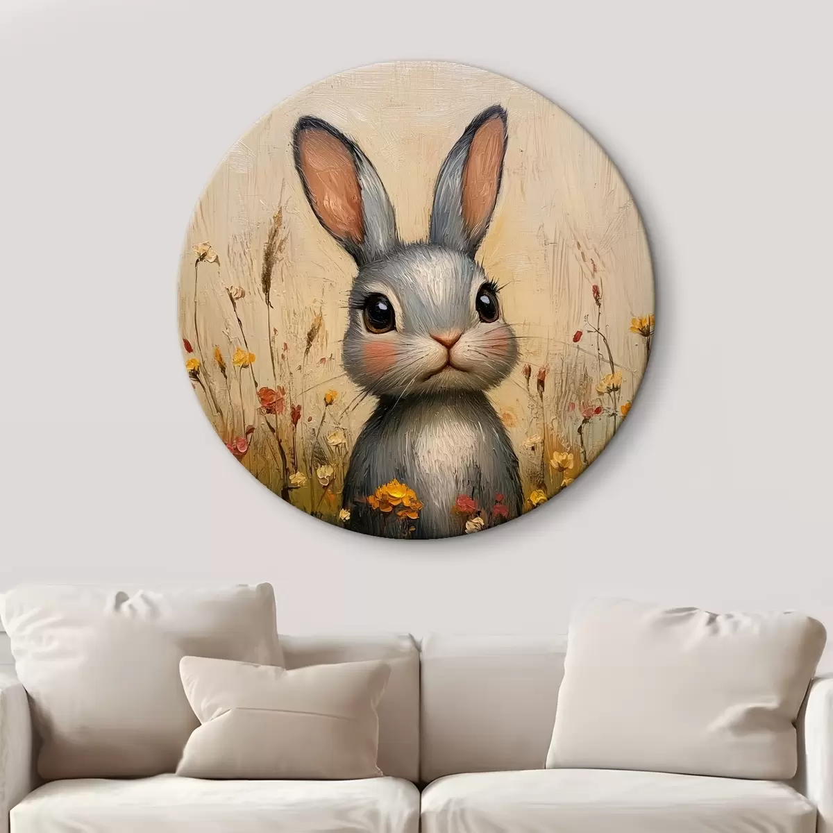 Ronde schilderijen Konijn in het veld tussen bloemen met penseelstreken r40999