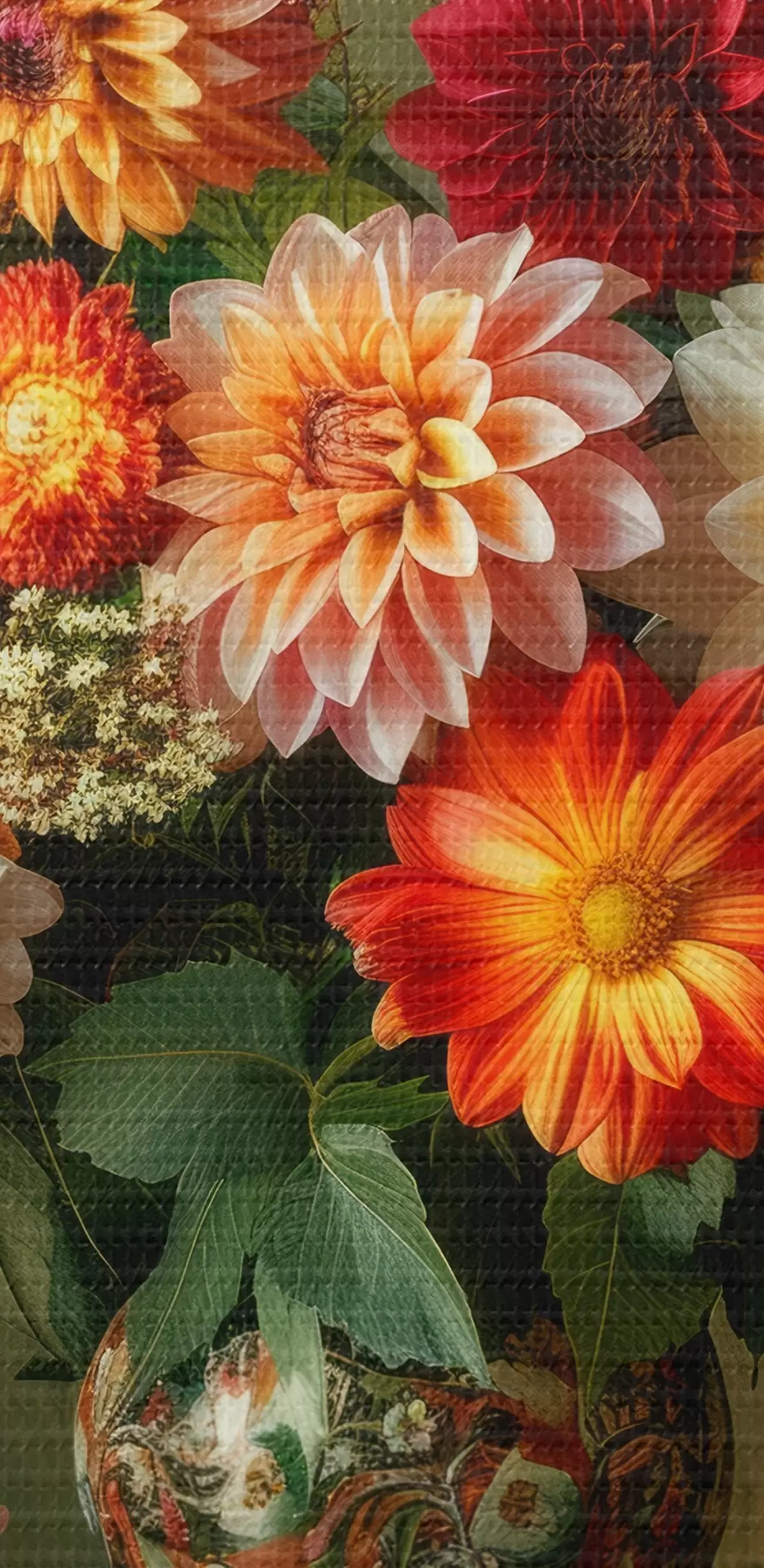Ronde schilderijen Een weelderig boeket chrysanten in een vaas tegen een achtergrond van diepgroen r41001