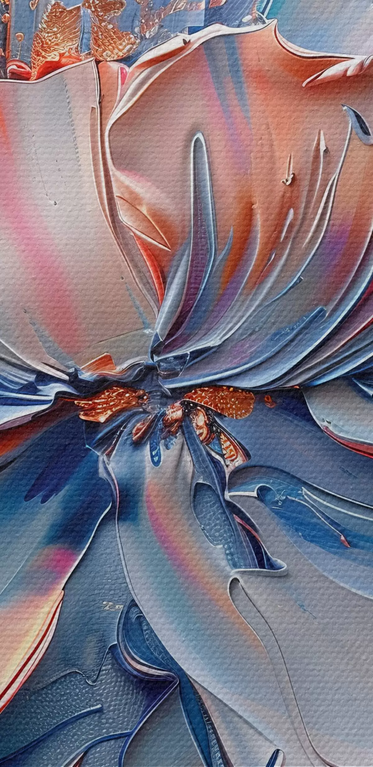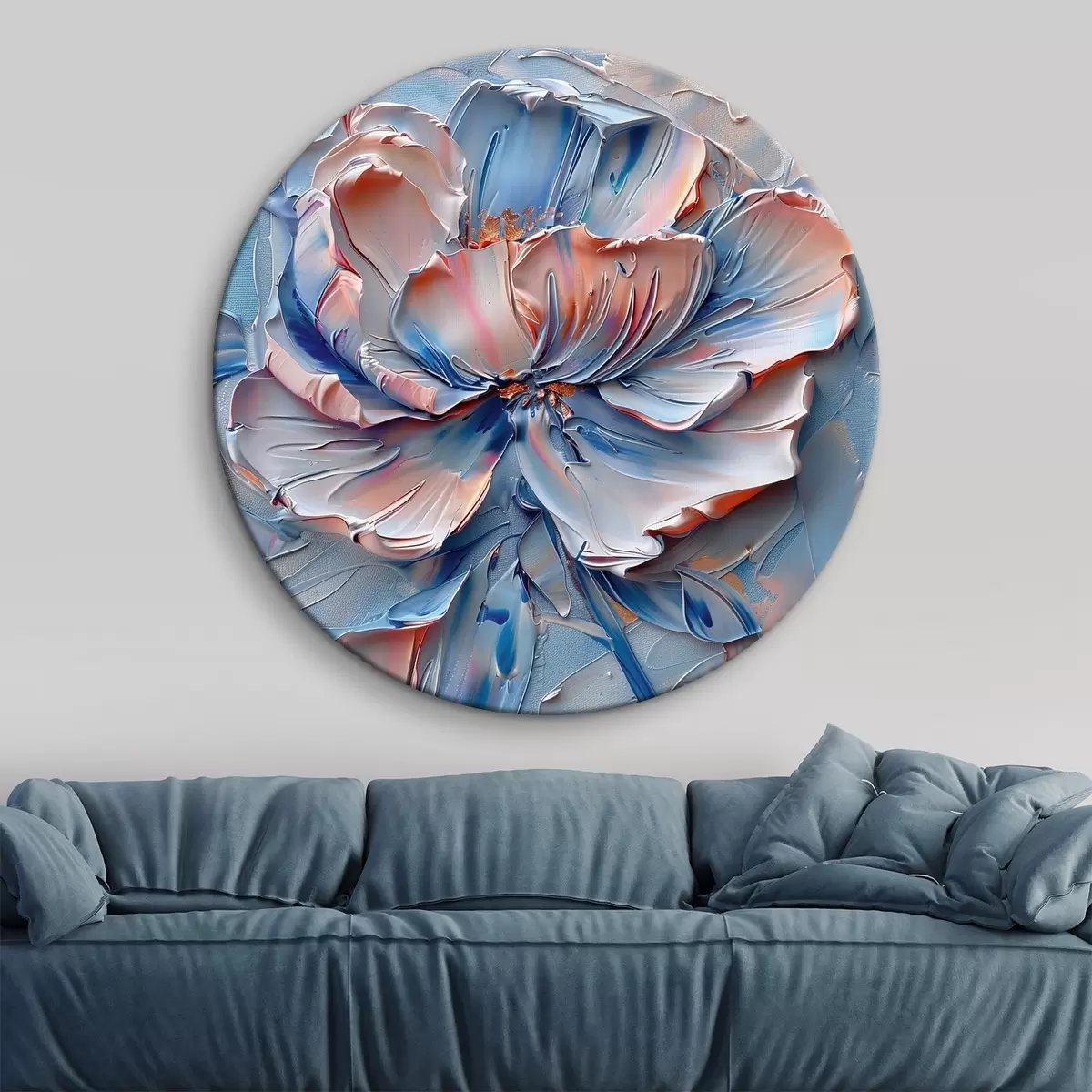 Ronde schilderijen Een grote bloem met gedurfde penseelstreken in blauw en perzik Nr r41004