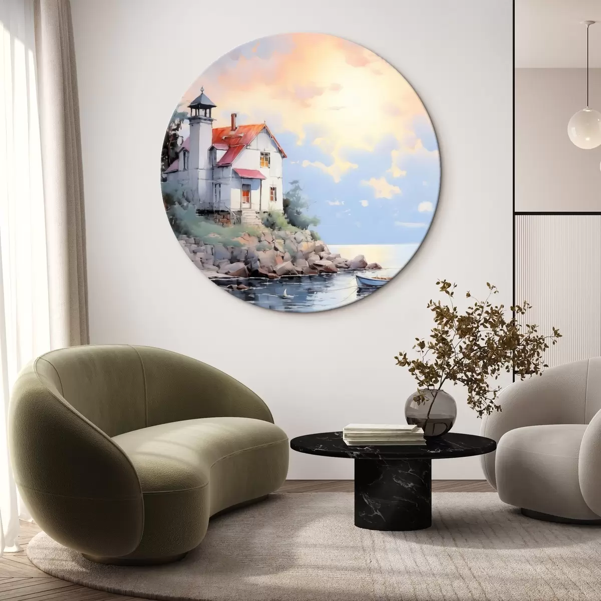 Ronde schilderijen Strandhuis aan zee bij zonsondergang Nr r41010