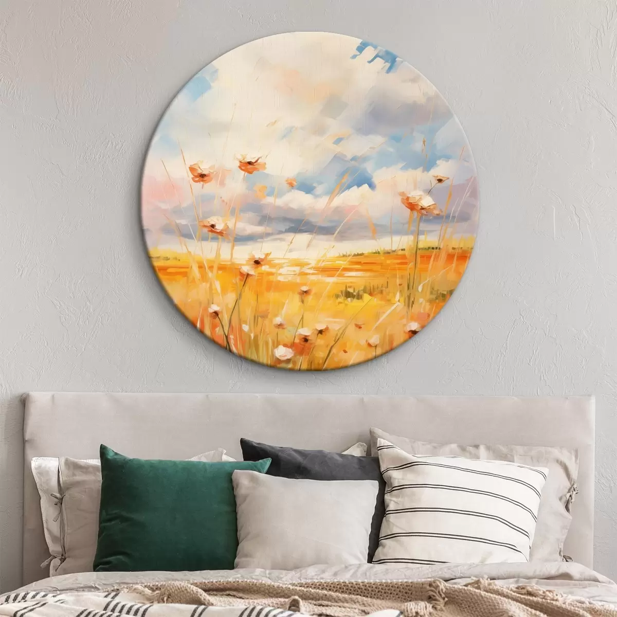 Ronde schilderijen Veld met droog gras tegen de lucht met wolken Nr r41014