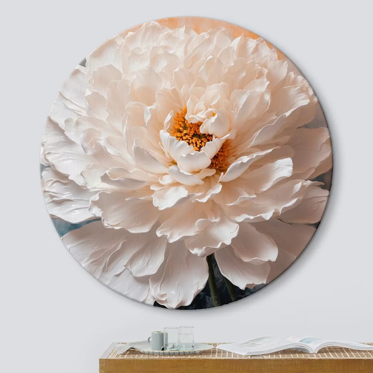 Ronde schilderijen Witte bloem op oranje-blauwe achtergrond Nr r41038