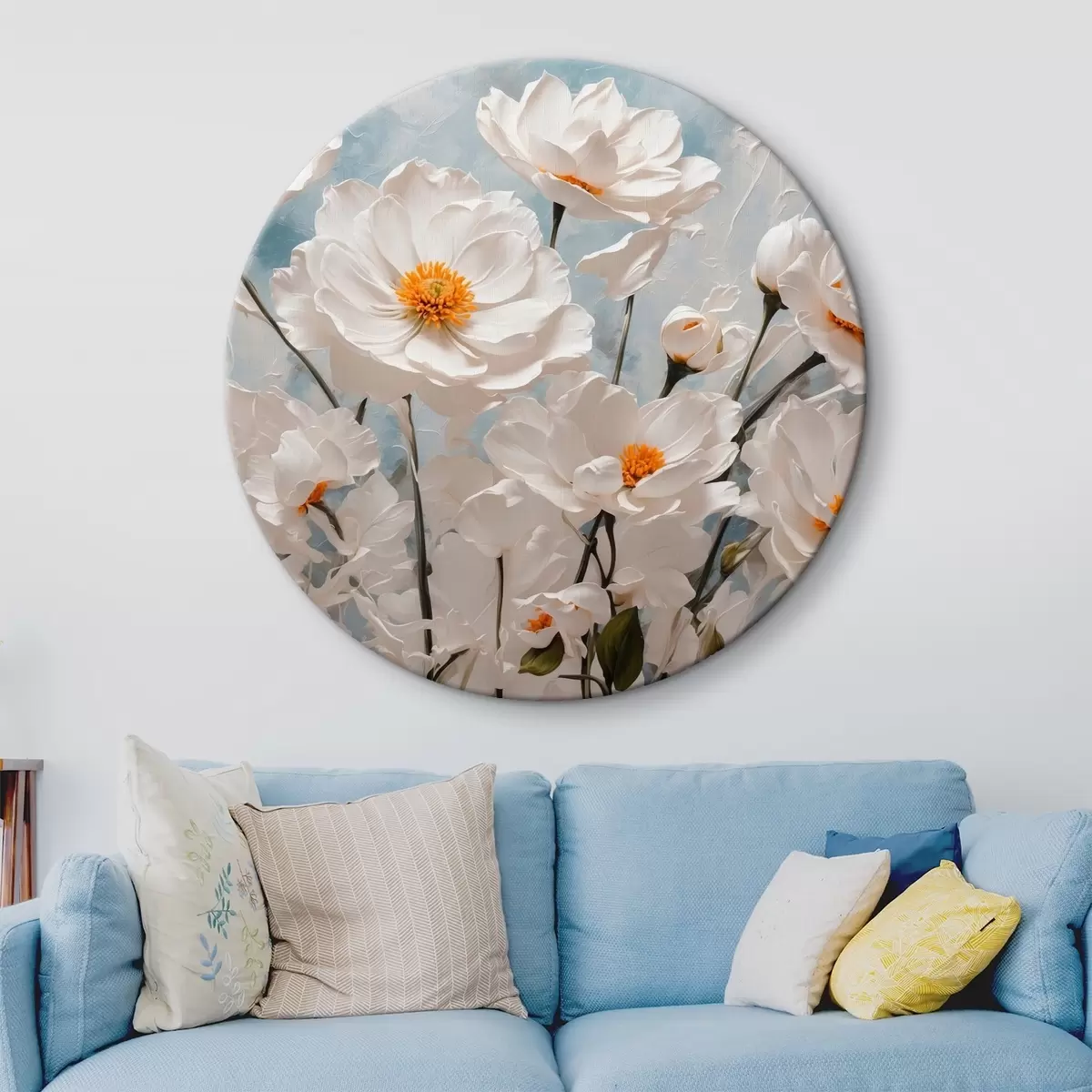 Ronde schilderijen Witte bloemen op een blauwe en witte olie-achtergrond r41041