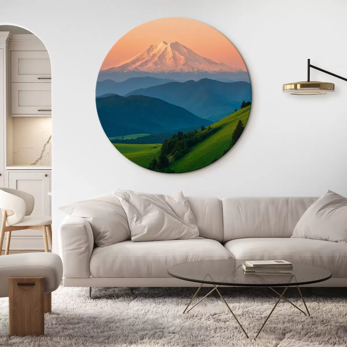 Ronde schilderijen Uitzicht op een kalme, met sneeuw bedekte vulkaan Nr r41046