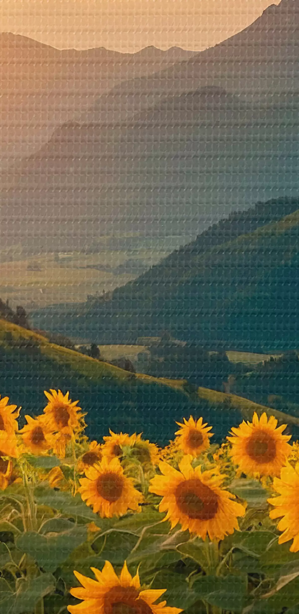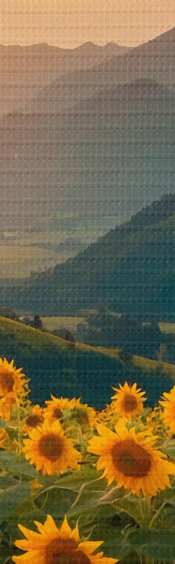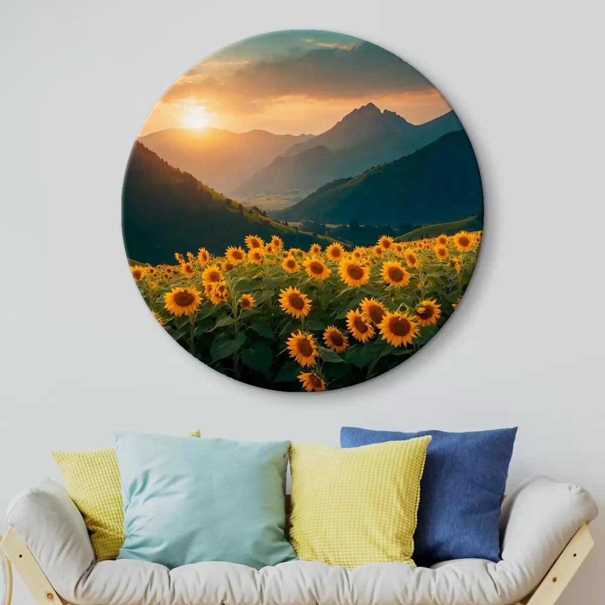 Ronde schilderijen Zonnebloemen tegen de achtergrond van bergen Nr r41049