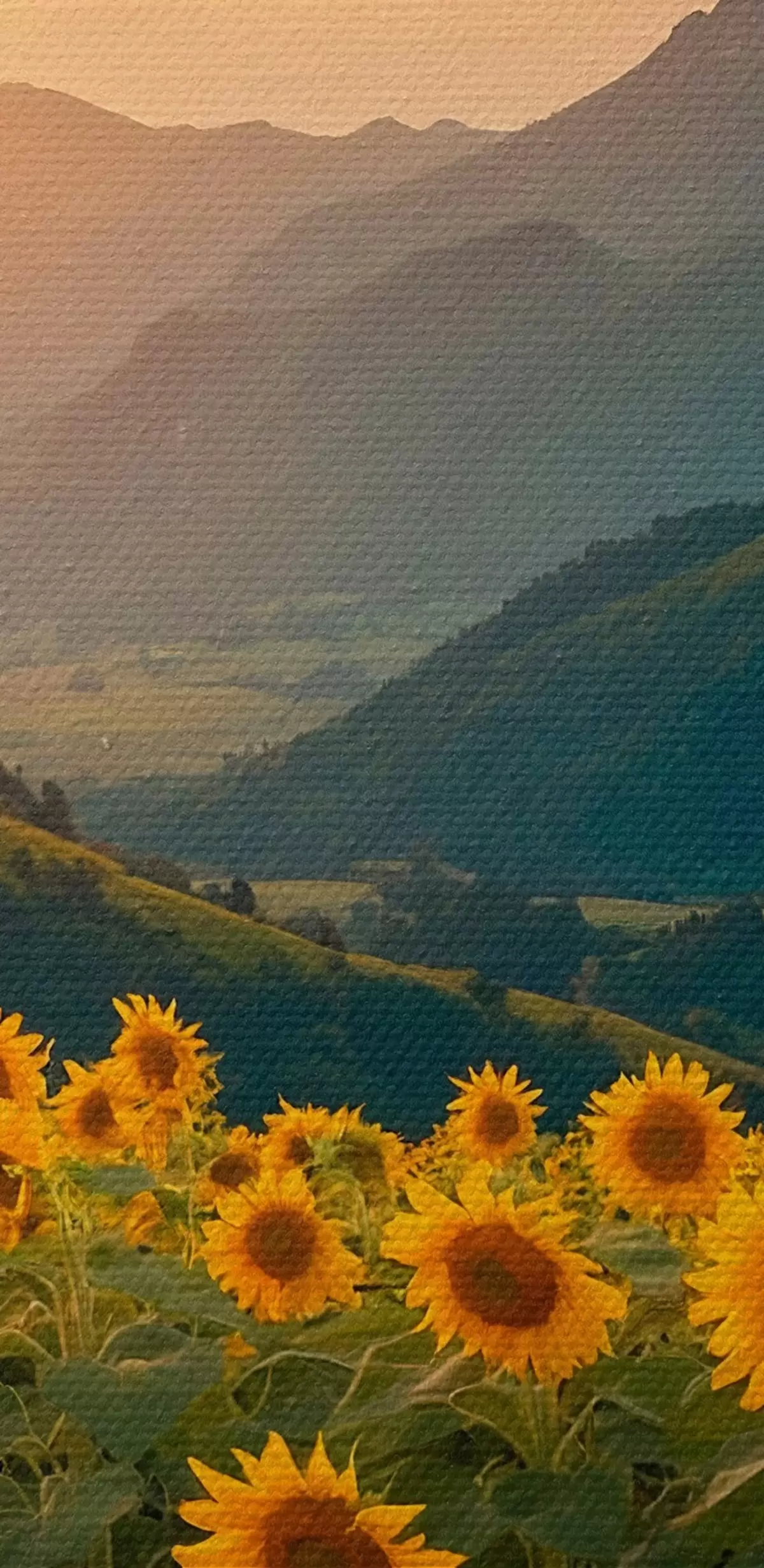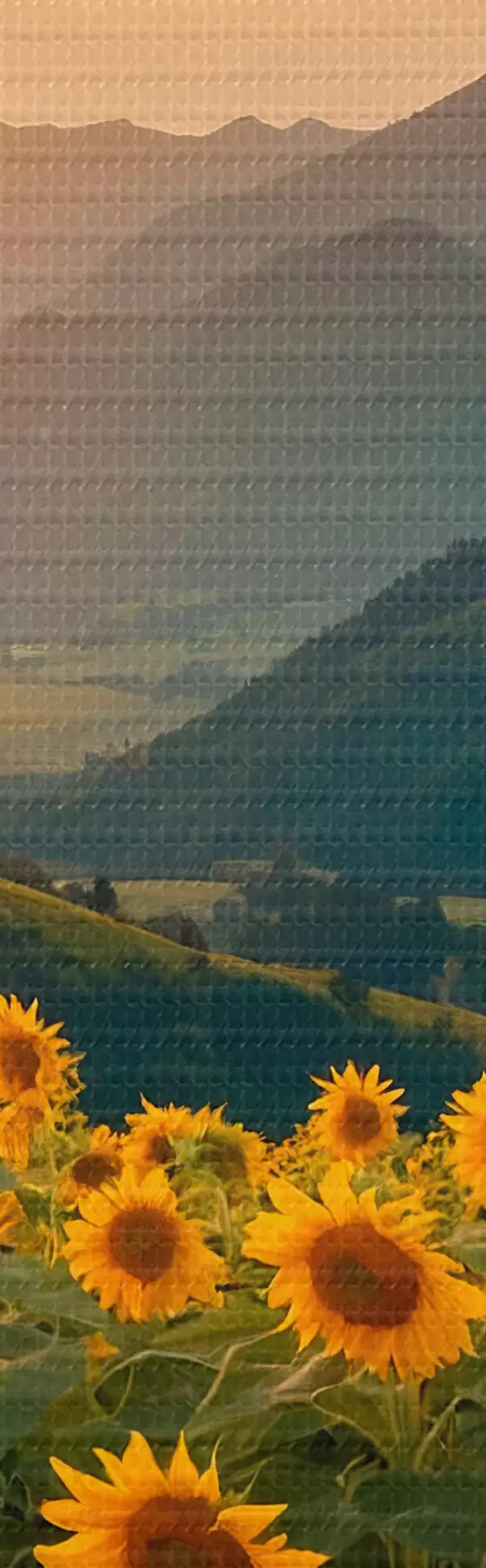 Ronde schilderijen Zonnebloemen tegen de achtergrond van bergen r41049